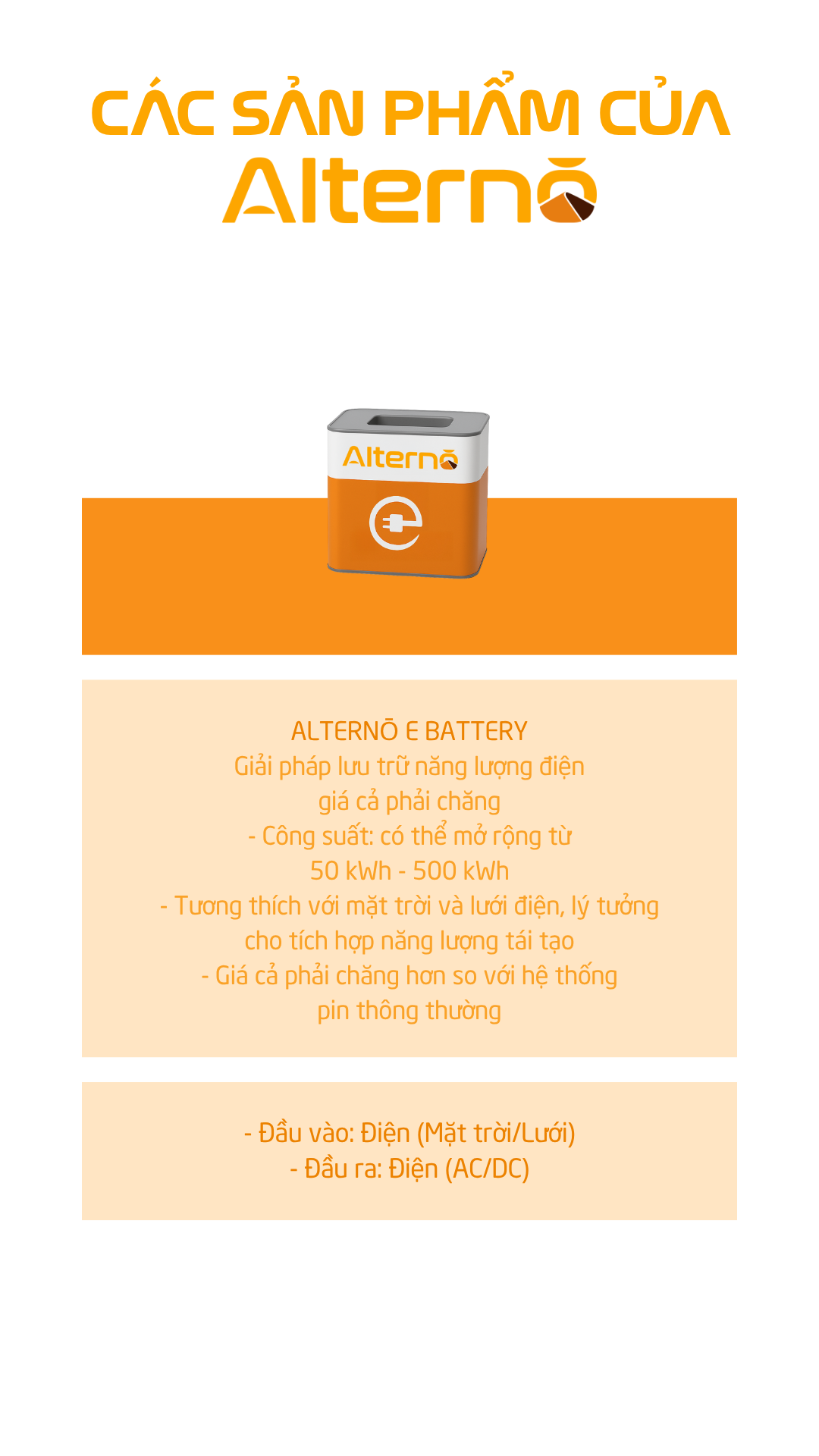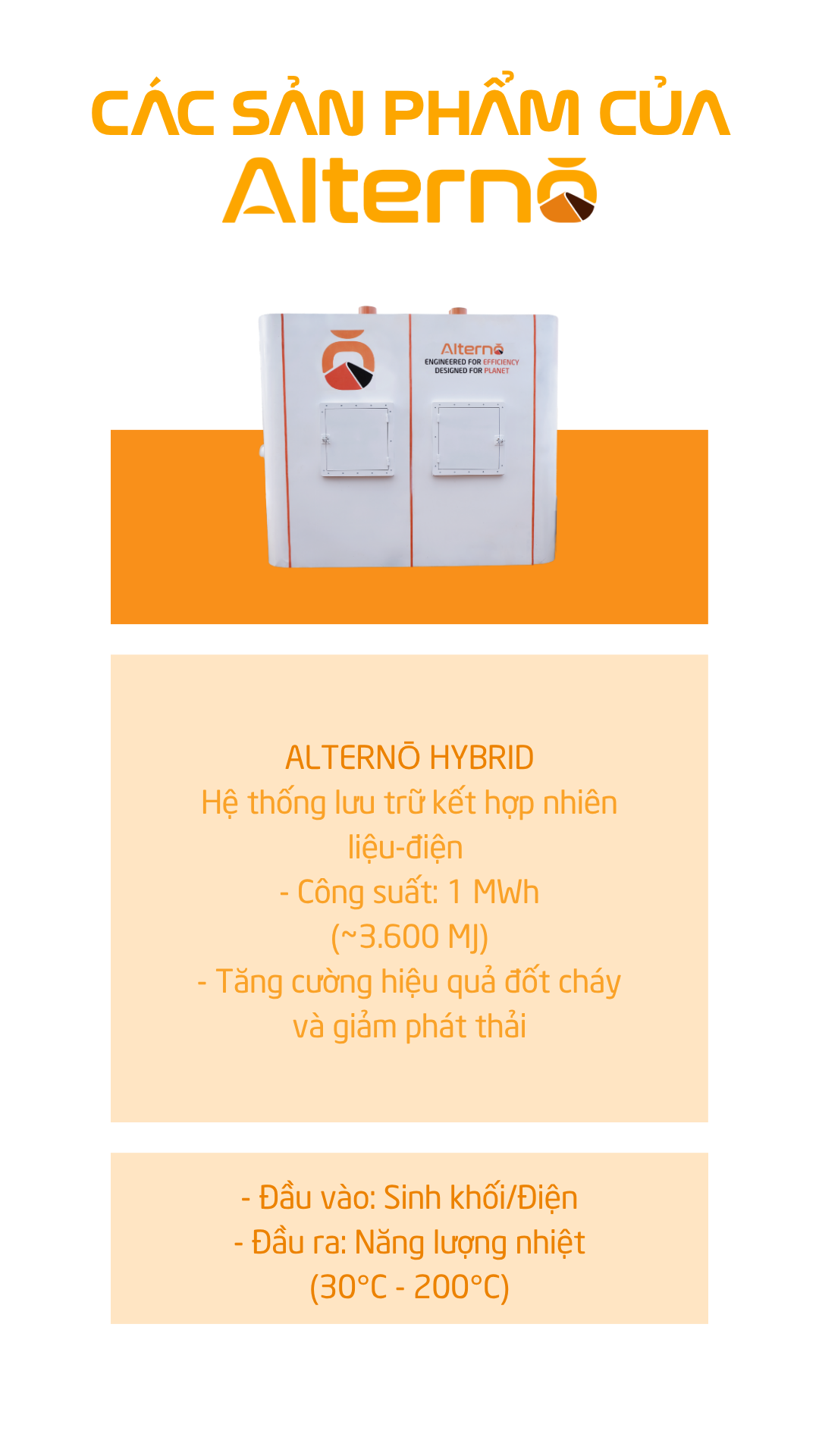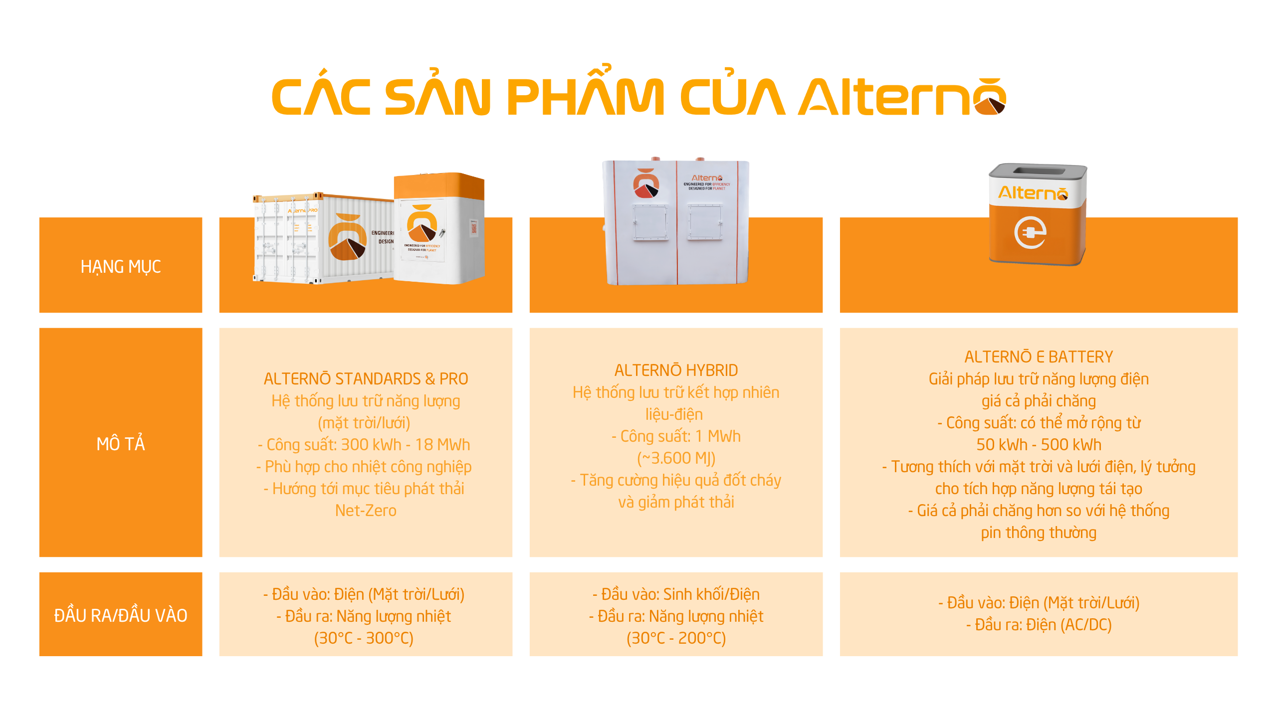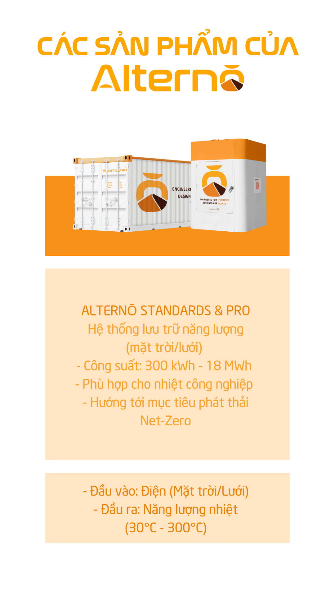 Hiện tại, Alternō có pin lưu nhiệt gồm Alternō Standard, dung lượng là 300 kWh, với một số ngành như ngành trà, cà phê, ngành sấy thực phẩm nhẹ sẽ đáp ứng được cho một máy vận hành trong một ca tám tiếng. Pin Alternō Pro lưu trữ được 1.8 MWh, gấp bảy lần phiên bản Standard, có thể cung cấp lượng nhiệt tương đương nhưng với thời gian dài hơn và các pin có thể kết hợp với nhau, tức là muốn tăng công suất lên chỉ cần mua thêm nhiều và lắp ghép lại với nhau, có thể đặt chồng lên nhau để tiết kiệm diện tích. Ngoài ra, có một số dòng sản phẩm mới, ví dụ như Alternō Hybrid, tạo ra nhiệt bằng đốt sinh khối, dành cho những thị trường như Nhật Bản. Đồng thời, Alternō cũng đã vừa nghiên cứu thành công hệ thống pin mới dùng cát để lưu trữ điện thay vì lưu trữ nhiệt.