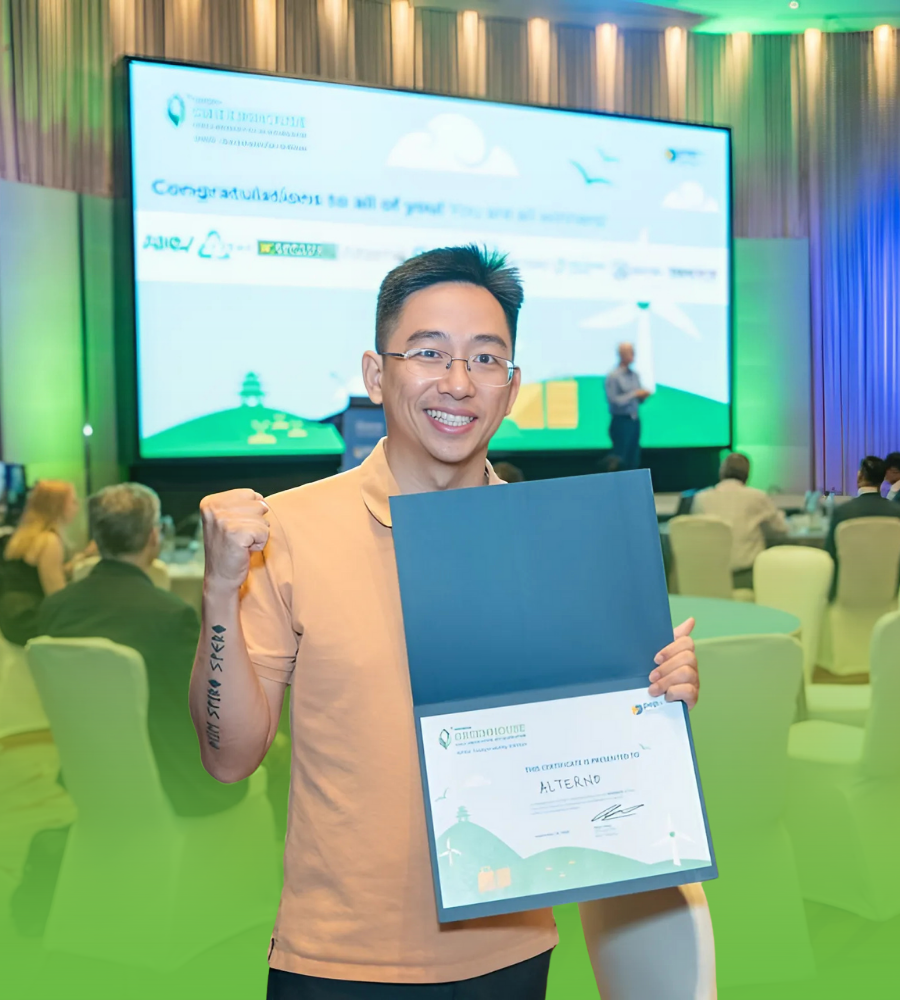 CEO Hồ Việt Hải: Điều tôi tự hào nhất luôn luôn là đội ngũ. Rất nhiều anh em đều có bố, mẹ xuất thân là nông dân và chính họ đang sấy bằng những phương pháp truyền thống. Các bạn bảo em làm trước hết là cho công ty, nhưng quan trọng nhất là em đang làm cho bố mẹ mình. Điều đó làm tôi thực sự cảm động, tự hào, hy vọng câu chuyện của Alterno và công nghệ này cũng như rất nhiều các công ty khởi nghiệp trong mảng xanh tại Việt Nam sẽ là một sự khởi đầu của ngành công nghiệp xanh. Chúng ta có thể đi sau ở một số ngành công nghiệp cơ khí, những thứ đã đi xa nhưng công nghiệp xanh tôi có thể đi tắt, đón đầu và có thể xây dựng được thương hiệu quốc gia Việt Nam. Việt Nam chúng ta có rất nhiều bài toán về rác thải nhưng ở nơi có nhiều bài toán, nhiều khó khăn, đó là nơi đẻ ra những giải pháp. Tôi tin chắc chắn rằng chỉ một thời gian nữa, khoảng năm 2030, sẽ có một phát kiến từ Việt Nam thay đổi hoàn toàn cục diện này.