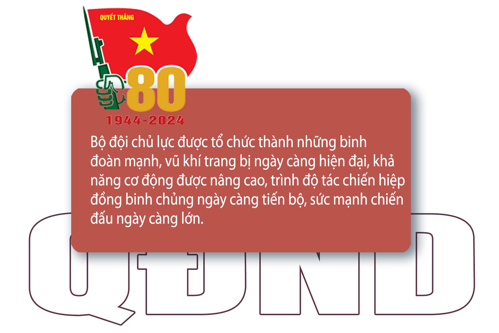 Bộ đội chủ lực được tổ chức thành những binh đoàn mạnh, vũ khí trang bị ngày càng hiện đại, khả năng cơ động được nâng cao, trình độ tác chiến hiệp đồng binh chủng ngày càng tiến bộ, sức mạnh chiến đấu ngày càng lớn. Bộ đội địa phương được củng cố, trang bị được tăng cường, khả năng chiến đấu được nâng cao”.