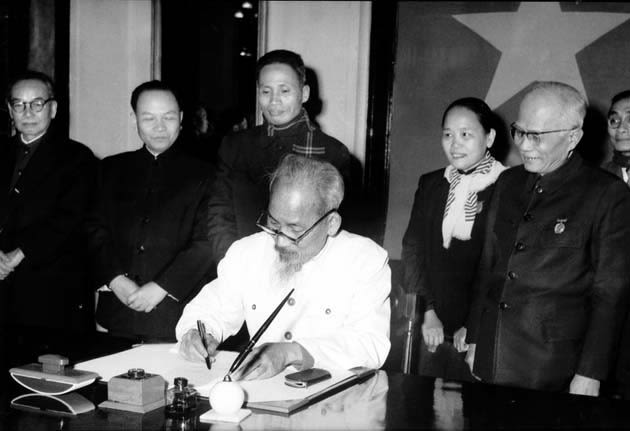Chủ tịch Hồ Chí Minh chứng kiến Thủ tướng Phạm Văn Đồng ký lệnh công bố HIến pháp mới (1/1/1960). Ảnh: TTXVN