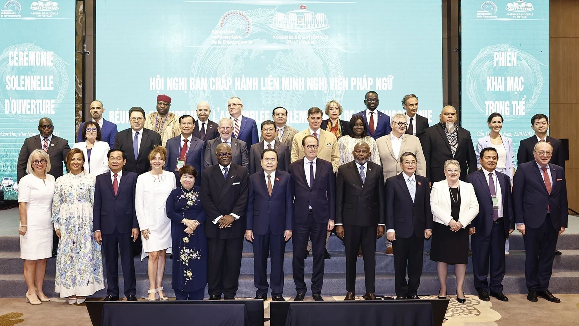 Chủ tịch Quốc hội Trần Thanh Mẫn với các đại biểu dự Hội nghị Ban Chấp hành Liên minh Nghị viện Pháp ngữ (APF) tại thành phố Cần Thơ, ngày 22/1/2025.