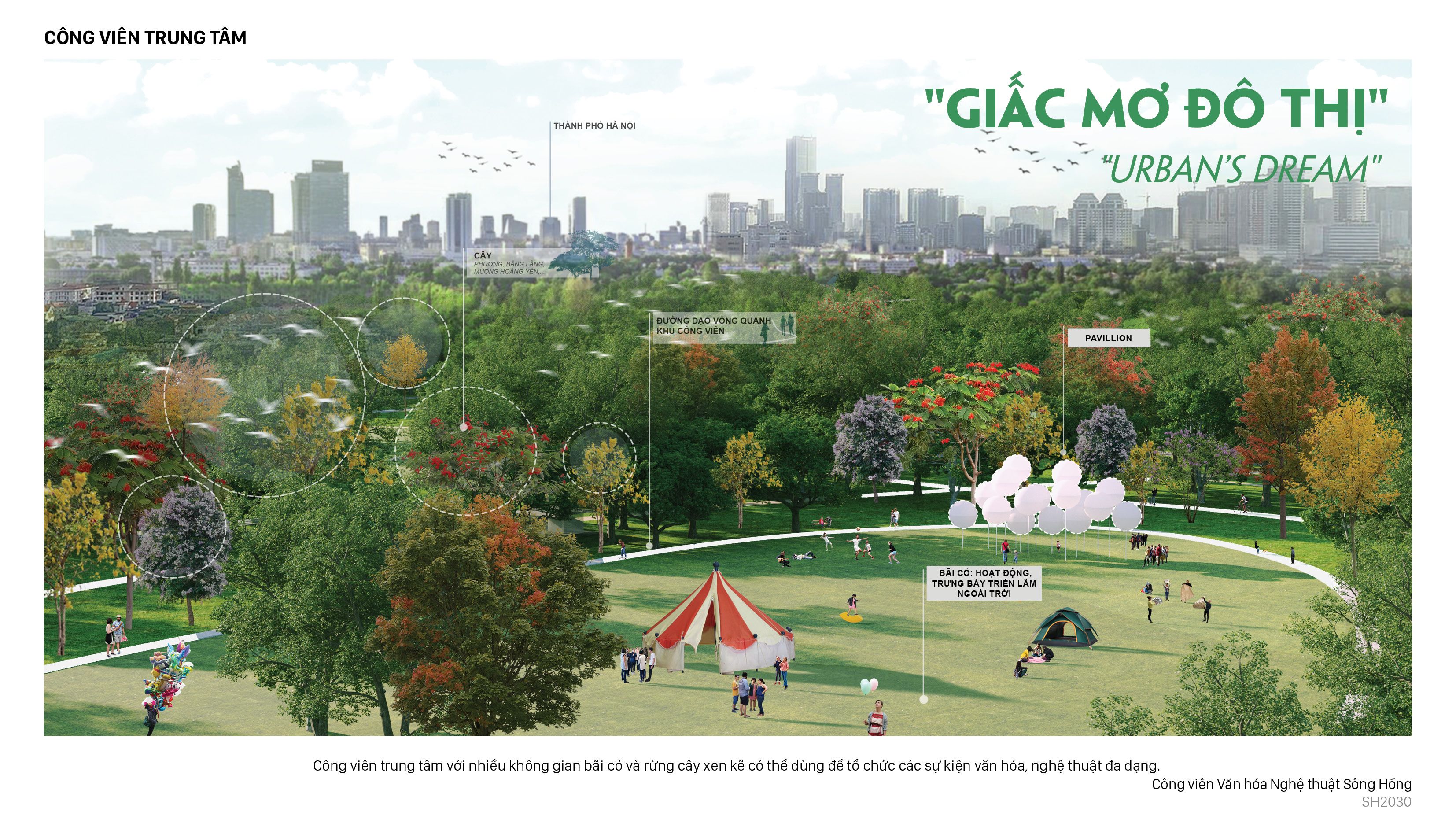 Với vị trí đặc biệt trong lòng thủ đô, Hà Nội của tương lai xứng đáng có một không gian vượt lên trên một công viên đơn thuần. Dự án là mô hình mẫu trực quan về tính bền vững và khả năng phục hồi, công viên mới sẽ tập trung vào sức khỏe và thể chất của con người nhờ thiên nhiên thông qua 4 chủ đề: nước; đa dạng sinh học bền vững và tạo dựng nơi chốn.