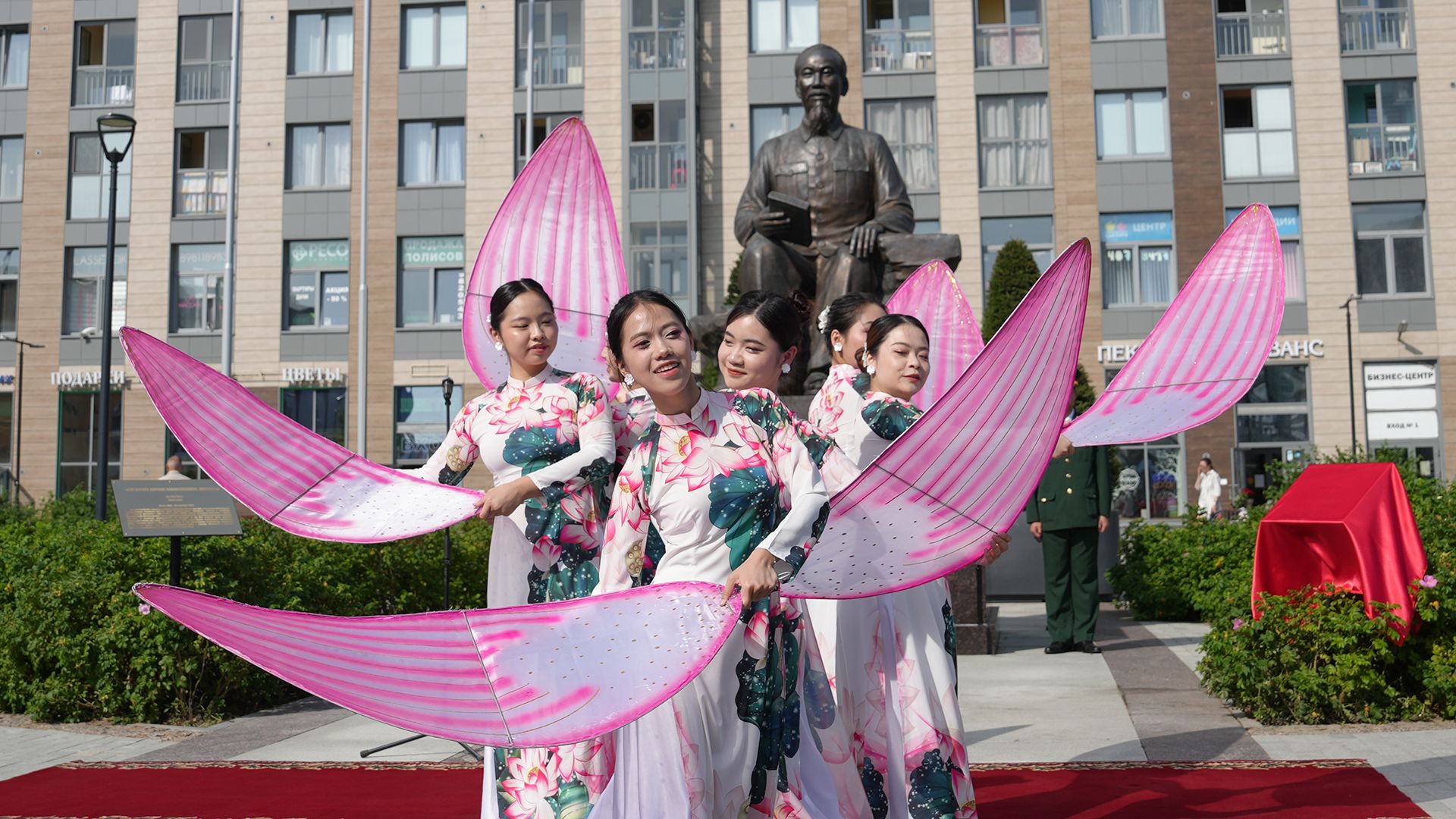 Sinh viên Việt Nam biểu diễn văn nghệ trước Tượng đài Chủ tịch Hồ Chí Minh ở thành phố Saint Petersburg. (Ảnh: Xuân Hưng)