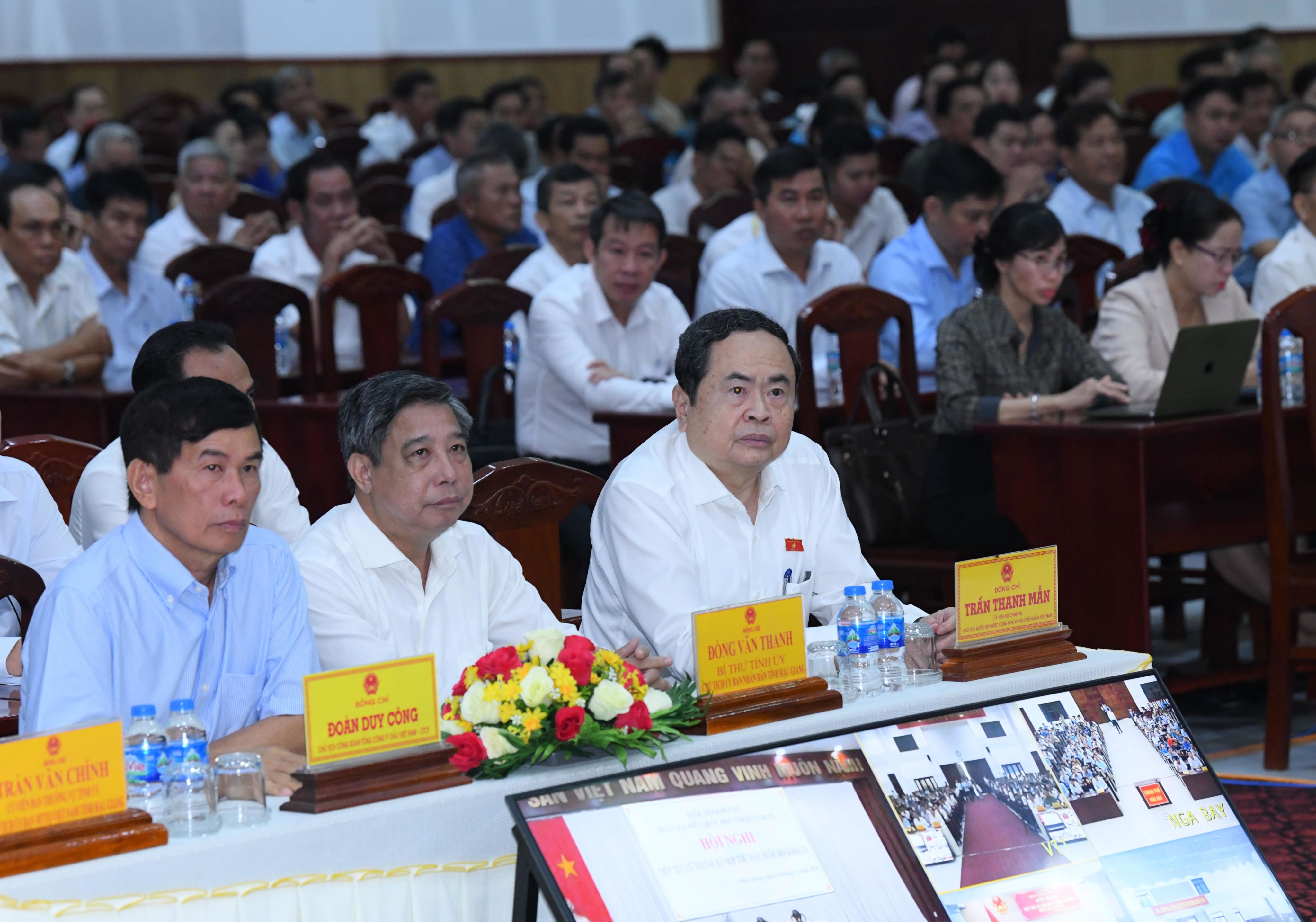 Chủ tịch Quốc hội Trần Thanh Mẫn cùng các đại biểu dự cuộc tiếp xúc cử tri tỉnh Hậu Giang sau Kỳ họp thứ 8, Quốc hội khóa XV. Ảnh: LÂM HIỂN