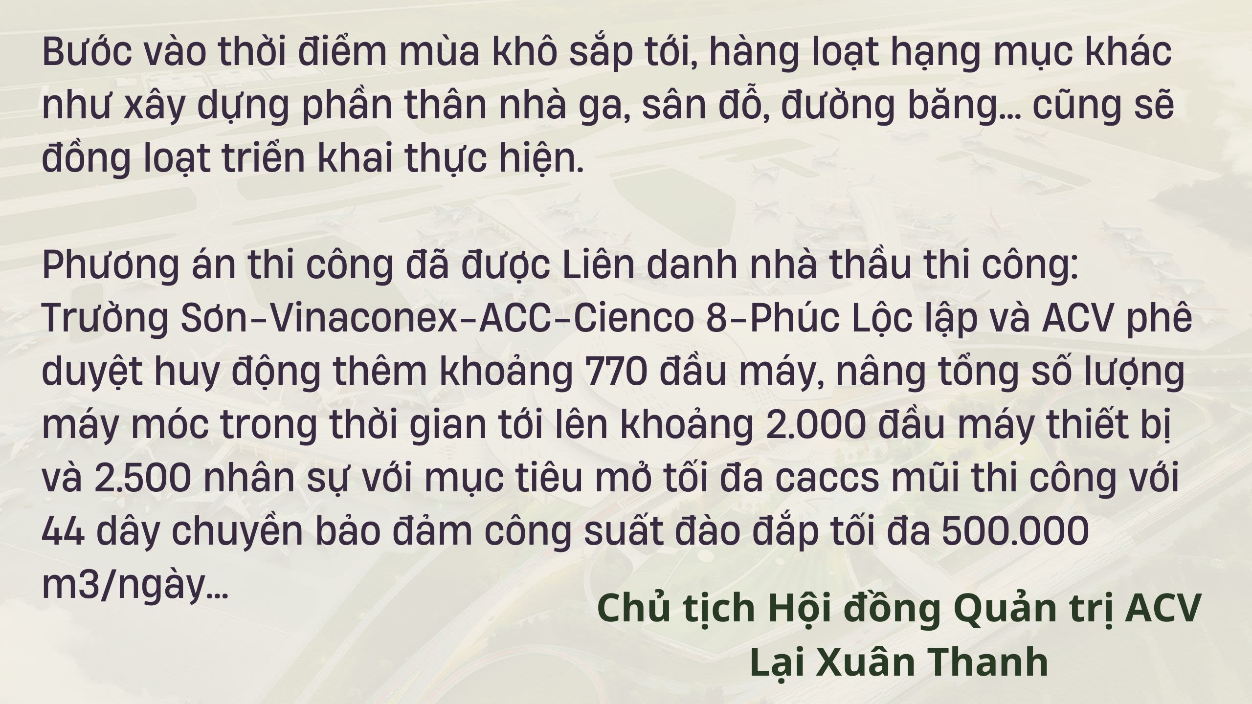 Thời gian thực hiện Dự án còn lại không nhiều (khoảng 3 năm), như chúng ta đã biết, Kế hoạch đặt ra đối với Giai đoạn 1 là chậm nhất năm 2025 hoàn thành và đưa vào khai thác 1 đường cất hạ cánh và 1 nhà ga hành khách cùng các hạng mục phụ trợ đồng bộ với công suất 25 triệu hành khách/năm, nhà ga hàng hóa 1,2 triệu tấn hàng hóa/năm.