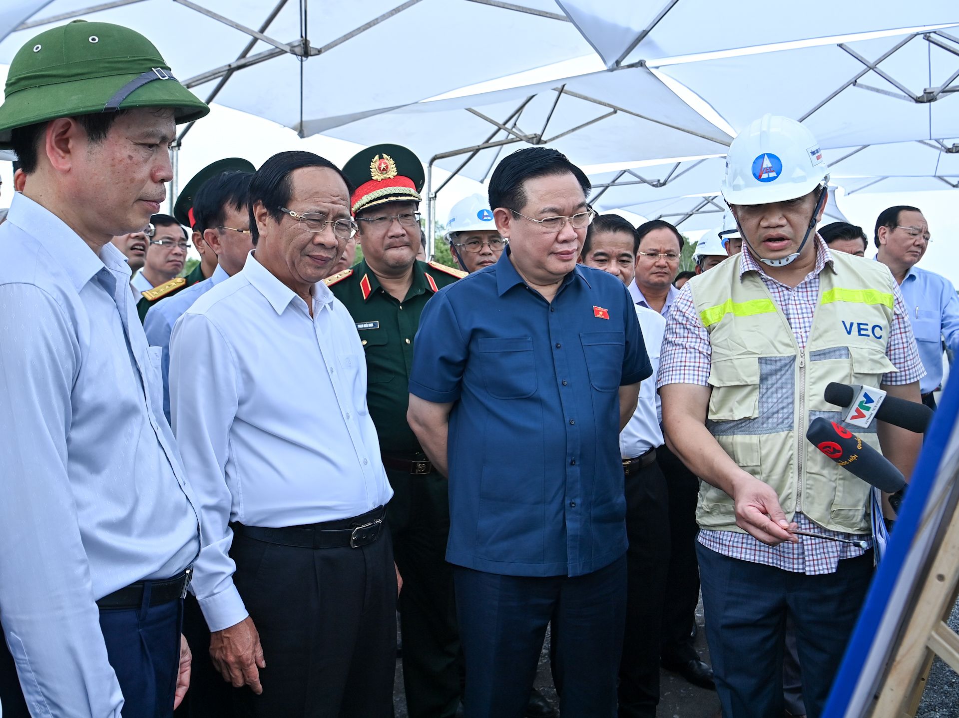 Chủ tịch Quốc hội Vương Đình Huệ nghe đơn vị thi công dự án sân bay Long Thành báo cáo về tổng thể quy hoạch, tiến độ thi công các hạng mục.