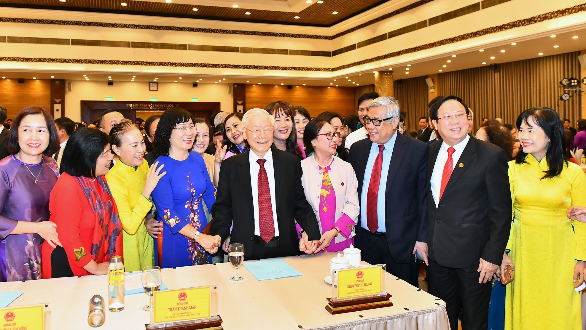 Tổng Bí thư Nguyễn Phú Trọng và các đại biểu dự Lễ kỷ niệm 60 năm Chủ tịch Hồ Chí Minh gặp mặt đội ngũ trí thức và 40 năm Ngày thành lập Liên hiệp Các hội Khoa học và Kỹ thuật Việt Nam.