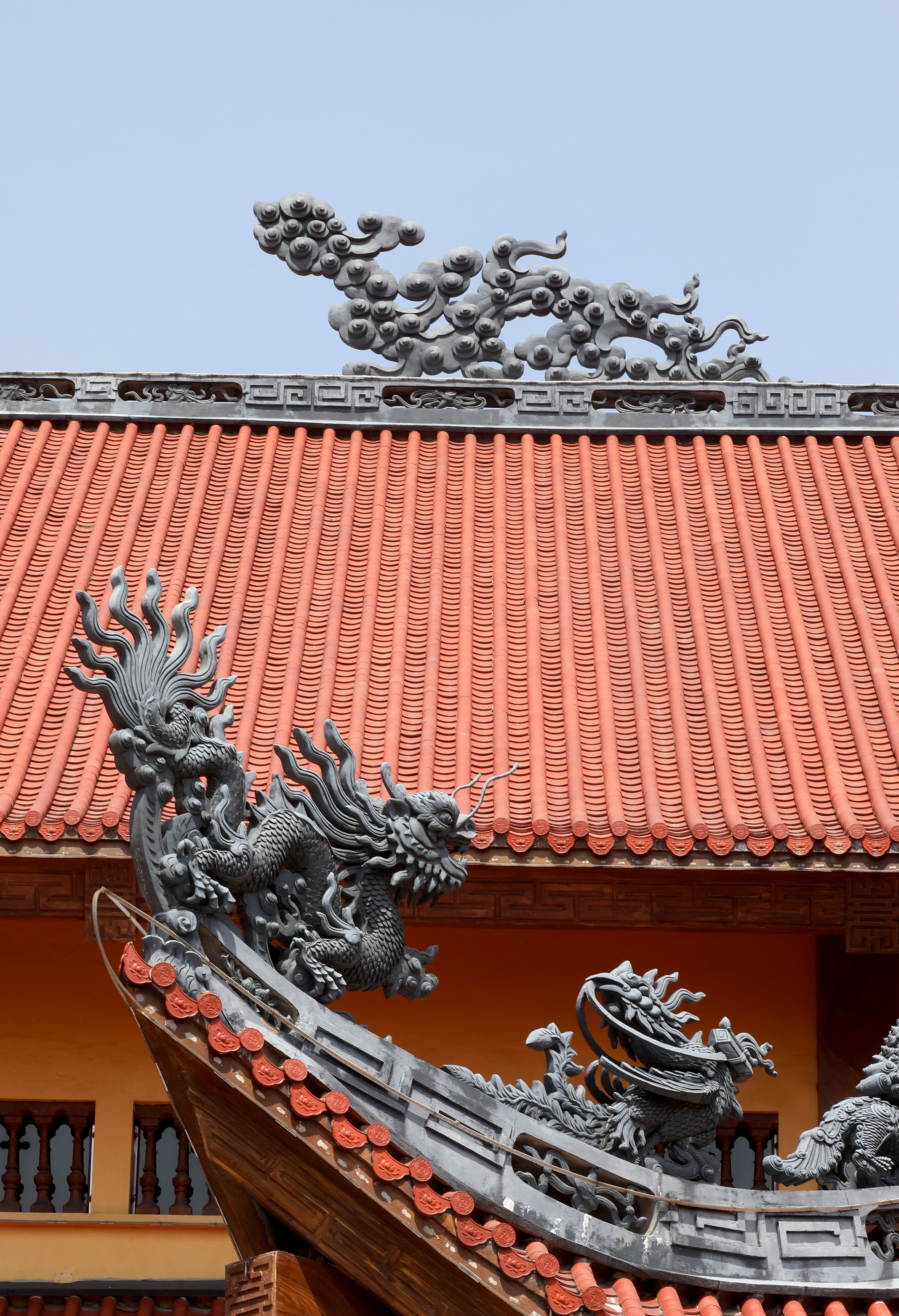 Rồng thời Nguyễn trong kiến trúc Huế mang kiểu thức “Lưỡng Long chầu nhật” trên đỉnh mái.