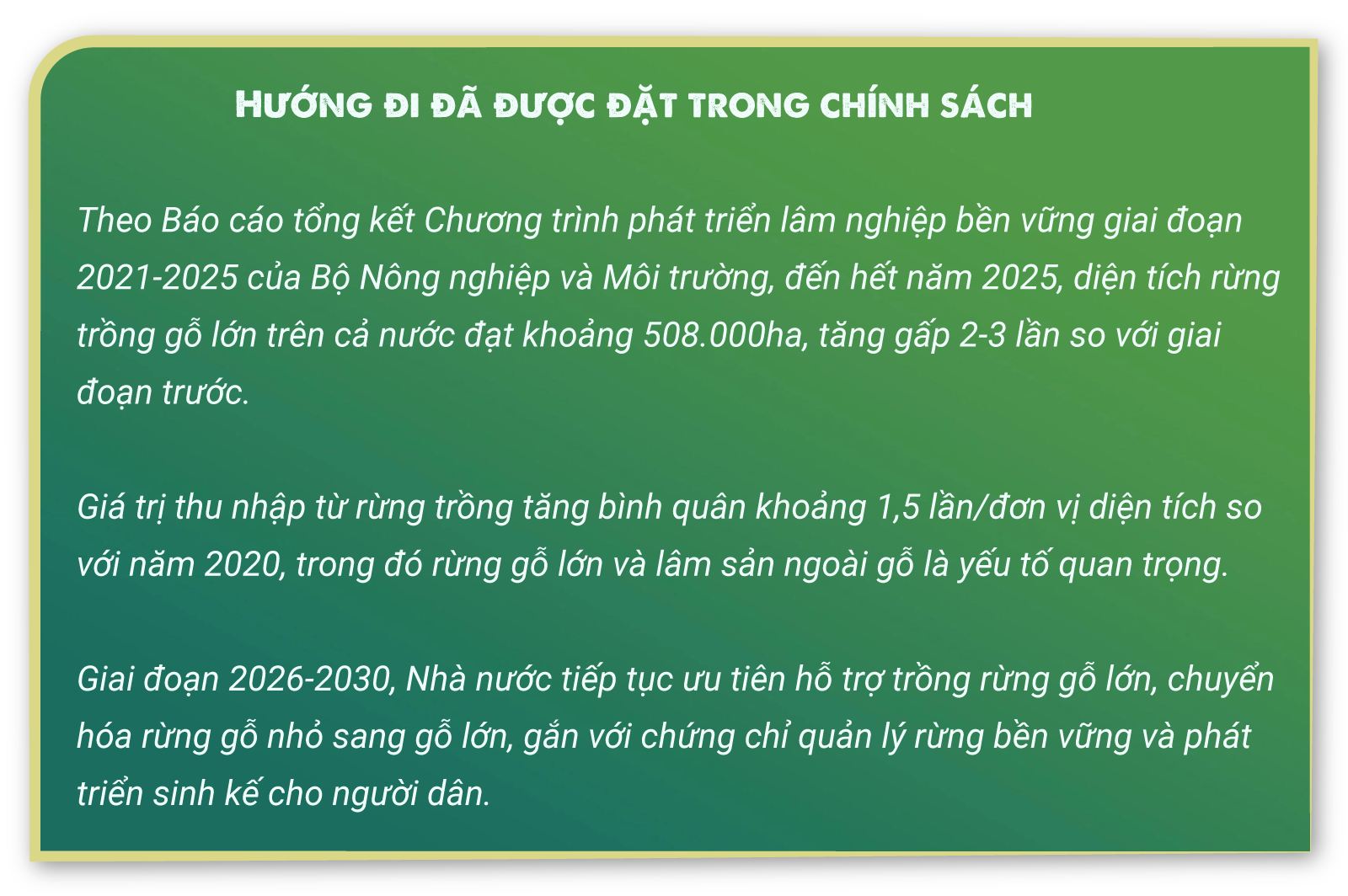 Trong bối cảnh nhiều cánh rừng tự nhiên đã bị suy giảm chất lượng qua thời gian dài khai thác, xâm lấn và có nơi buông lỏng quản lý, việc phục hồi rừng không thể dừng lại ở những con số “độ che phủ” trên giấy. Điều cốt lõi là phải tái thiết được cấu trúc rừng, tái sinh được hệ sinh thái. Và rừng gỗ lớn là lời đáp dài hơi cho bài toán ấy. Song, đó là con đường gian nan, đòi hỏi nguồn lực lớn, sự kiên nhẫn và một tầm nhìn vượt ra khỏi nhiệm kỳ hay vòng quay vốn ngắn hạn.
