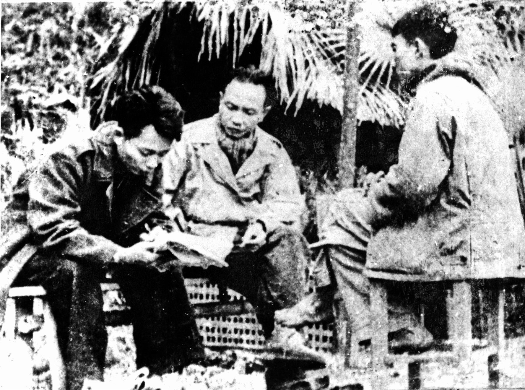 Đồng chí Trường Chinh, Thép Mới và Hà Xuân Trường duyệt bản thảo đăng Báo Nhân Dân số đầu tiên năm 1951. Ảnh Tư liệu