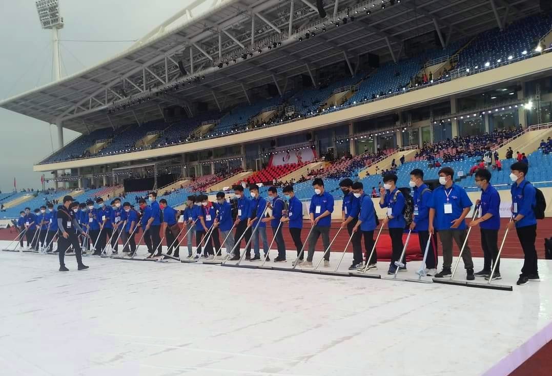 Cơn mưa đã dừng đúng lúc. Song, toàn bộ mặt sân Mỹ Đình và khu vực khán đài không có mái che, đã bị ướt sũng. Hàng trăm tình nguyện viên đã xuống sân dùng cây gạt nước lau khô sân khấu biểu diễn chính. Sau khi gạt nước, các bạn trẻ còn dùng khăn, thảm thấm nước.