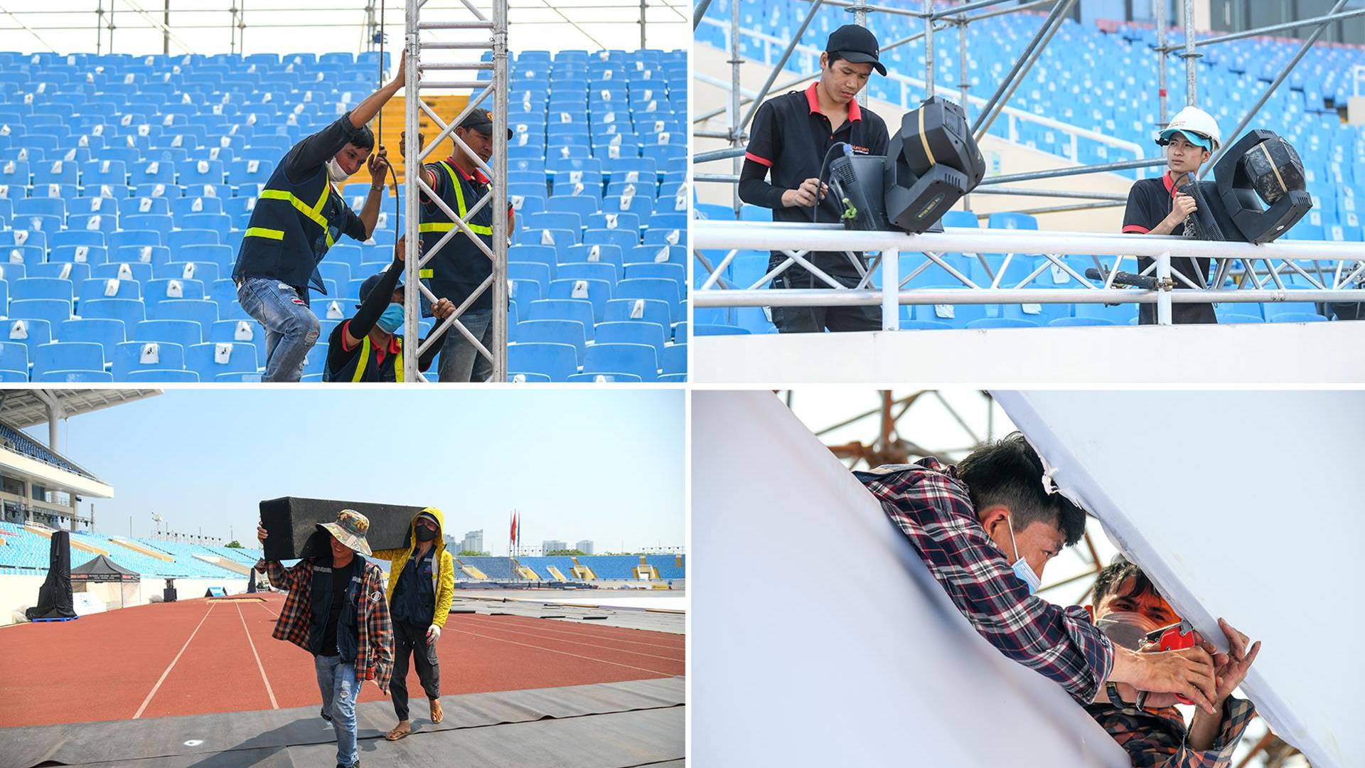 Cùng lúc ấy, trên các khán đài, tình nguyện viên và các nhân viên sân vận động cùng nhau lau khô từng chiếc ghế ngồi để sẵn sàng đón khách. Đặng Bảo Long, tình nguyện viên đến từ Đại học Quốc gia Hà Nội chia sẻ: “Dù vất vả nhưng em rất vui, mỗi người đóng góp một việc nhỏ giúp chương trình diễn ra thuận lợi hơn”.