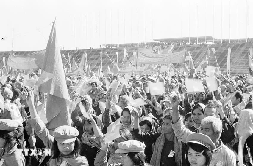 Nhân dân Campuchia trong Lễ mừng chiến thắng 7/1/1979, được tổ chức ngày 25/1/1979 tại sân vận động Olympic ở thủ đô Phnom Penh. (Ảnh: TTXVN)