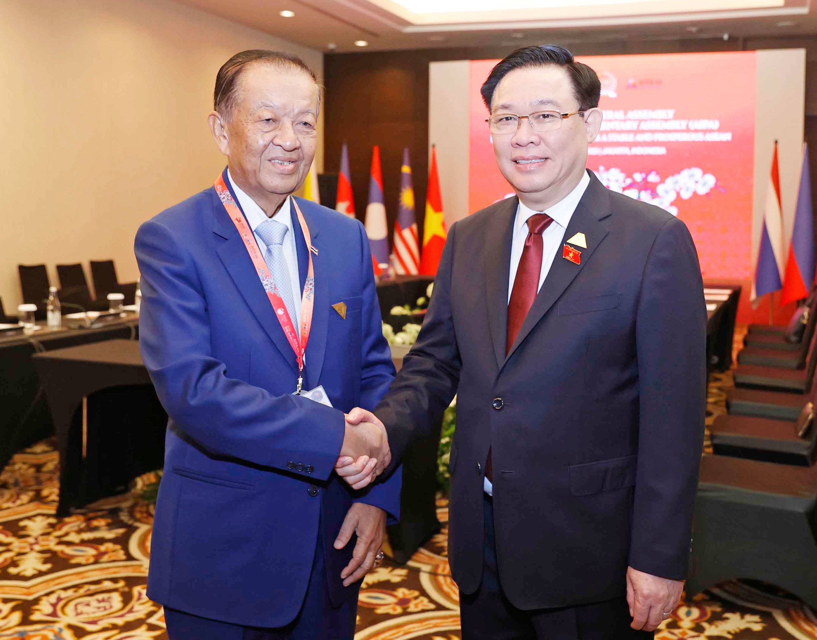 Ngày 7/8/2023, Chủ tịch Quốc hội Vương Đình Huệ có cuộc gặp với Chủ tịch Hạ viện Thái Lan Wanmuhamadnoor Matha nhân dịp tham dự Đại hội đồng AIPA lần thứ 44. Ảnh: quochoi.vn