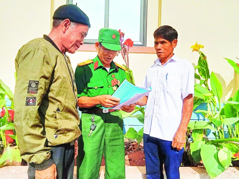 Già làng Ăm Kế (giữa) cùng người có uy tín xã Ba Tầng trao đổi kinh nghiệm tuyên truyền, vận động người dân.