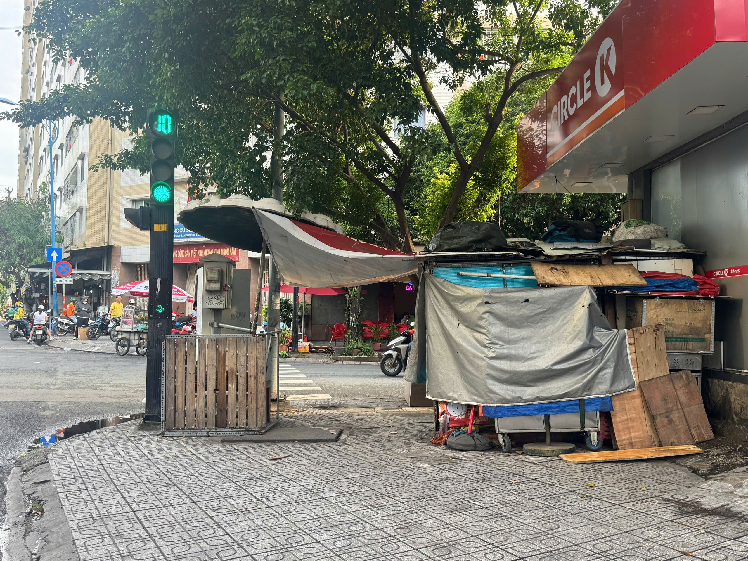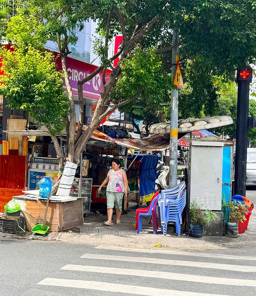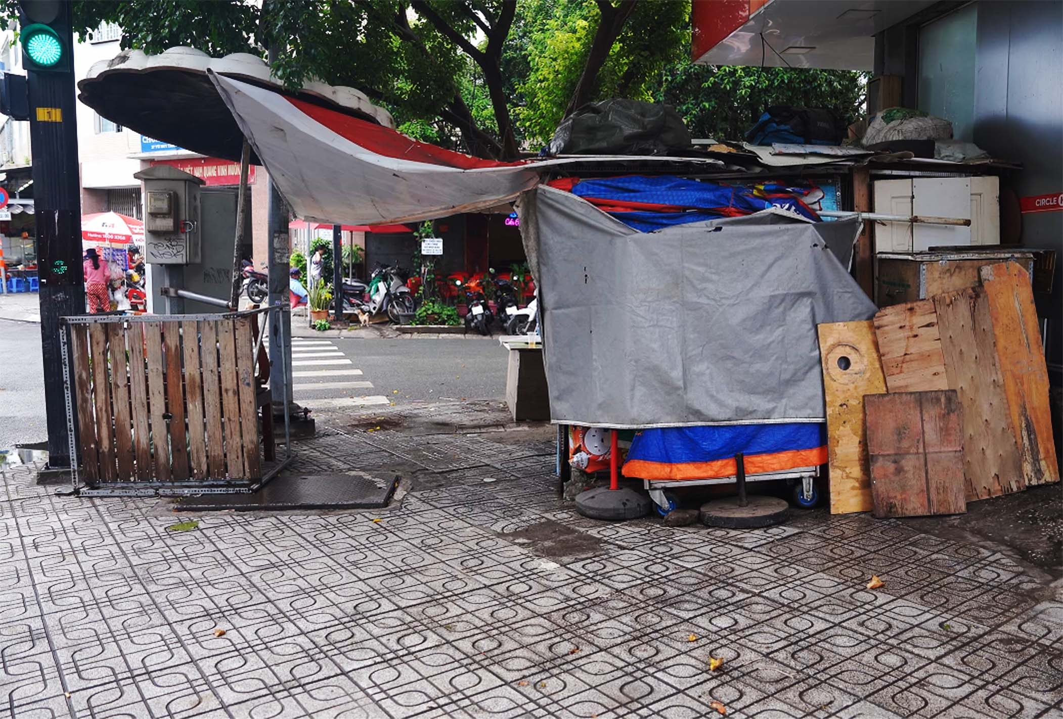 Nơi đặt chiếc tủ thuốc ấy, xuất hiện thêm vài người trong gia đình đến, và họ đem thêm gỗ, bạt chống mưa dựng khung. Diện tích chiếm dụng to dần, tuy nhiên vẫn chừa một khe hẹp để người đi bộ có thể lách qua giữa hai nơi đặt đồ đạc của họ. Họ vẫn thoải mái mà không bị ai nói gì.
