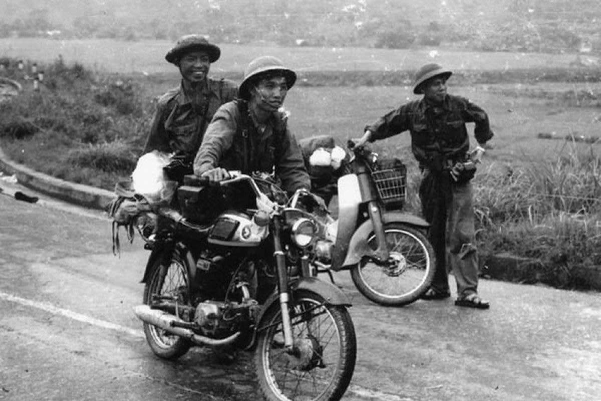 Nhà báo Hoàng Thiểm (ngồi phía sau xe máy) cùng tổ công tác vượt đèo Hải Vân vào Đà Nẵng ngày 29/3/1975.