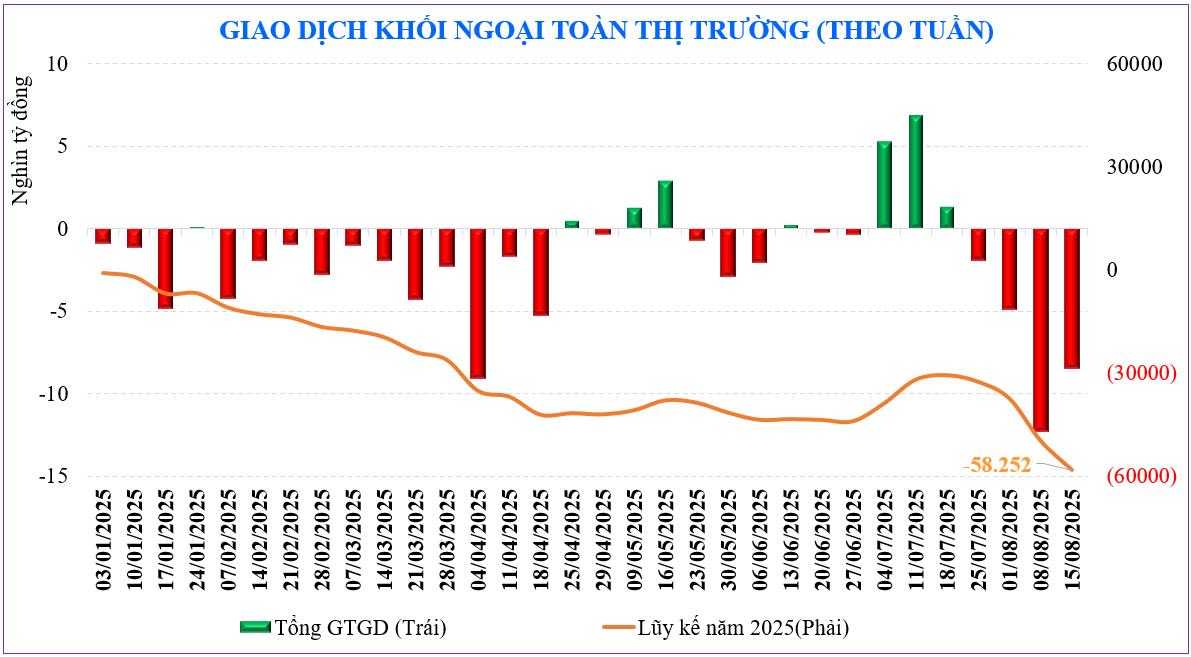 Khối ngoại duy trì bán ròng với -8.475 tỷ đồng – đây là tuần bán ròng thứ 4 liên tiếp của khối này. Như vậy, sau tuần mua ròng tháng 7, khối ngoại lại bán ròng gần -23.300 tỷ đồng trong nửa đầu tháng 8. Lũy kế từ đầu năm trên toàn thị trường, khối ngoại bán ròng -58.300 tỷ đồng.
