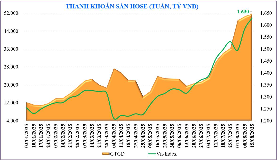 Không chỉ có điểm số, thị trường cho thấy dòng tiền cuồn cuộn từ khối nội. Nếu tháng 7, đà tăng có một phần nhận được trợ lực của dòng tiền ngoại, thì tháng 8 này, khối ngoại quay lại bán ròng khá lớn và khối nội không chỉ “cân tất” mà còn gia tăng. Theo thống kê, thanh khoản từ đầu tháng 8 tăng +202% so cùng kỳ và tăng +42% so với tháng 7, đạt 56.200 tỷ đồng. Đây là con số rất lớn và cũng hiếm thấy trên thị trường về dòng tiền. Chính dòng tiền cũng là chất xúc tác mạnh cho đà tăng của thị trường trong tuần qua và nhiều tuần gần đây.