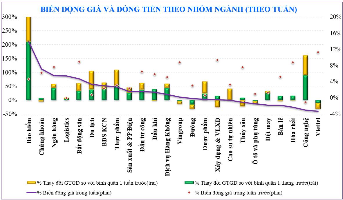 Một số nhóm cổ phiếu có mức tăng mạnh trên thị trường trong tuần vừa qua như: Bảo hiểm (+13,8%), chứng khoán (+7,1%), ngân hàng (+5,5%)… Ở chiều ngược lại, nhóm cổ phiếu đi ngược thị trường gồm: Viettel (-3,3%), công nghệ (-3,1%), hóa chất (-2,3%)…