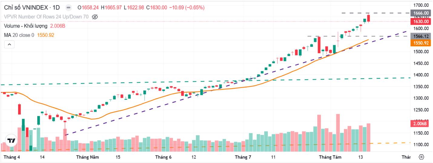 Thị trường chứng khoán nhìn chung tiếp tục cho thấy mức tăng rất mạnh mẽ. Riêng chỉ số VN-Index đang tăng tới gần 29% so với đầu năm và liên tiếp lập đỉnh mới. Điều đáng nói là thời gian tiến tới đỉnh mới cũng dần thu hẹp, nhất là mốc 1600 điểm được vượt qua khá dễ dàng.