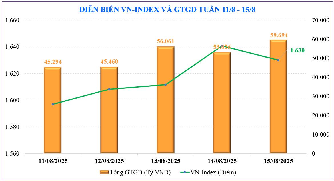 Thị trường chứng khoán Việt Nam cũng có một tuần duy trì đà tăng. Chỉ số VN-Index dù đứt mạch tăng 9 phiên liên tiếp nhưng vẫn có tuần tăng mạnh. Chốt tuần ở ngưỡng 1.630 điểm, tăng +45 điểm, tương đương tăng +2,8% so với tuần trước. Như vậy, chỉ số VN-Index đã đánh dấu tuần tăng thứ 8 trong 9 tuần gần đây.