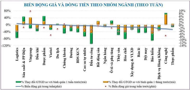 Chỉ số VN30-Index cũng giảm trong tuần -0,63% so tuần trước. Trong khi đó, các nhóm cổ phiếu Midcap với mức tăng +0,12% và Smallcap giảm -0,77%.