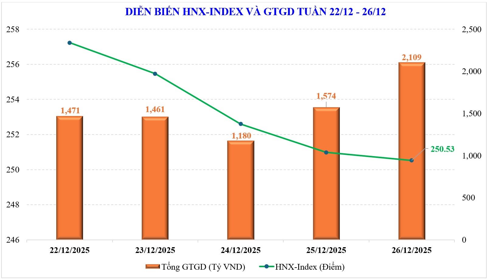Trong khi đó, HNX-Index đi qua 4 phiên giảm và chỉ 1 phiên tăng duy nhất ngày 22/12, tổng cộng cả tuần chỉ số HNX-Index kết tuần ở mức 250,53 điểm, giảm 3,44 điểm, tương đương -1,35% so với tuần trước đó. Chỉ số UPCOM-Index đóng cửa nhích nhẹ 0,56 điểm lên 119,74 điểm.