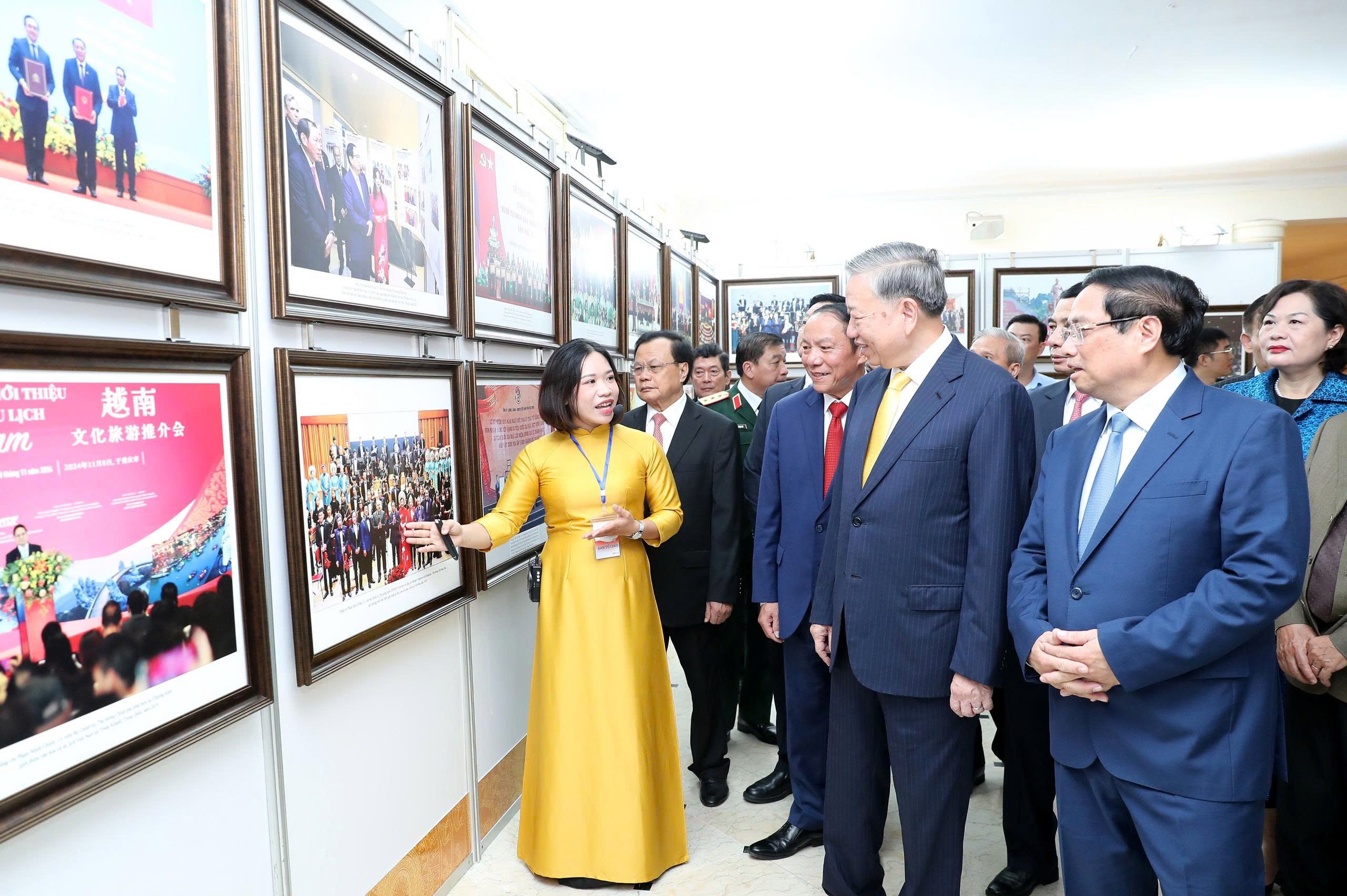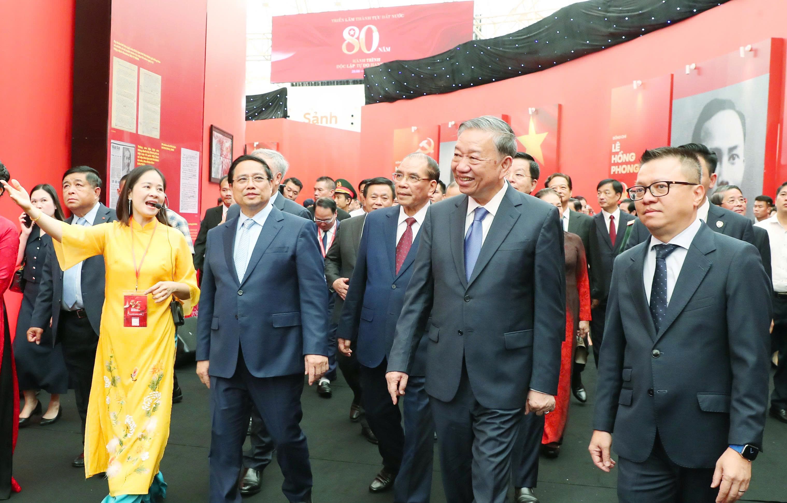 Các đồng chí lãnh đạo Đảng, Nhà nước tham quan Triển lãm thành tựu đất nước “80 năm Hành trình Độc lập-Tự do-Hạnh phúc”.