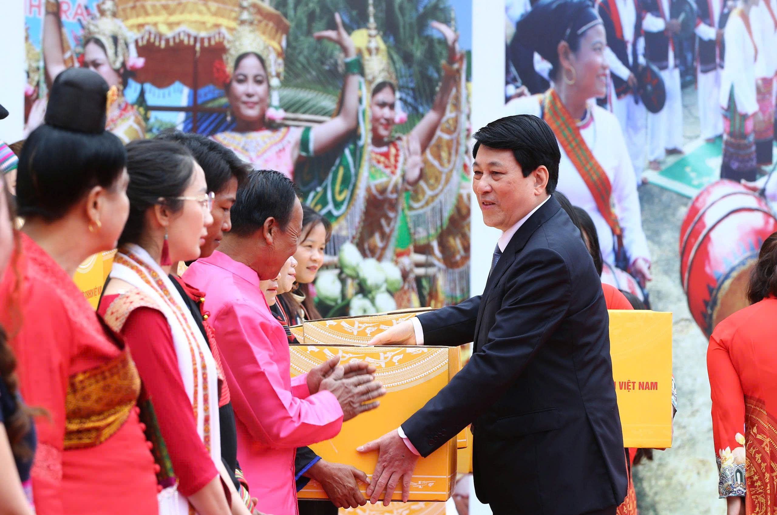 Chủ tịch nước Lương Cường trao quà, tặng đại diện các dân tộc anh em tại Ngày hội.