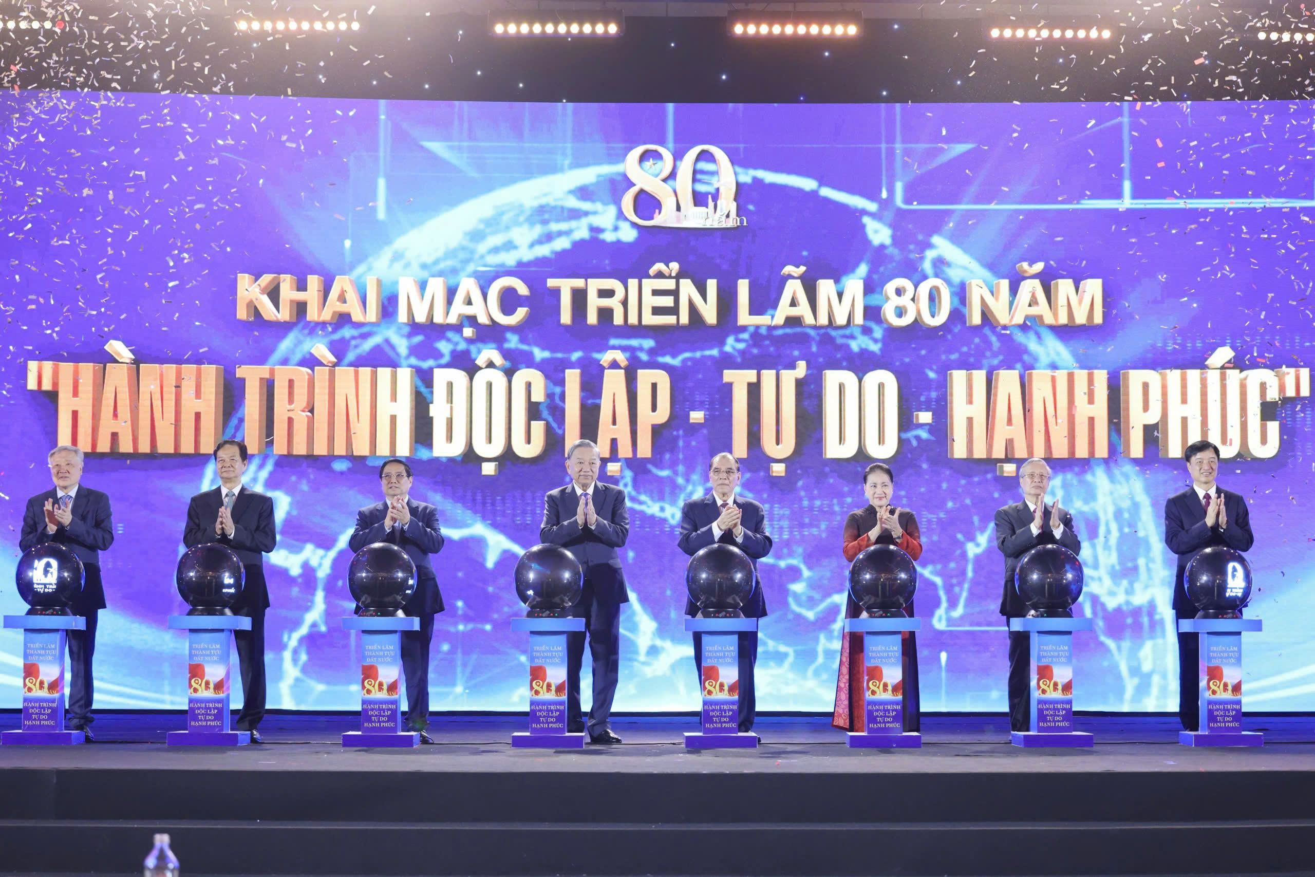Các đồng chí lãnh đạo Đảng, Nhà nước thực hiện nghi thức khai mạc Triển lãm thành tựu đất nước “80 năm Hành trình Độc lập-Tự do-Hạnh phúc”.