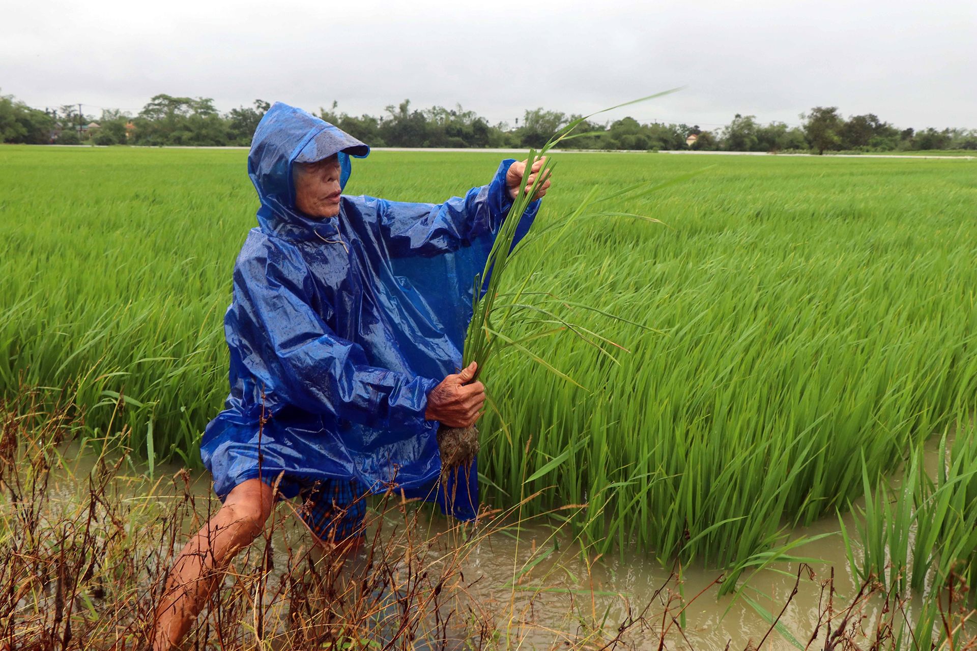 Người dân xã Hải quế, huyện Hải Lăng, tỉnh Quảng Trị dầm mưa đắp đê để bảo vệ diện tích lúa đang kỳ trổ bông, bị ngập úng, ngã đổ do mưa lũ. (Ảnh: Thanh Thủy)