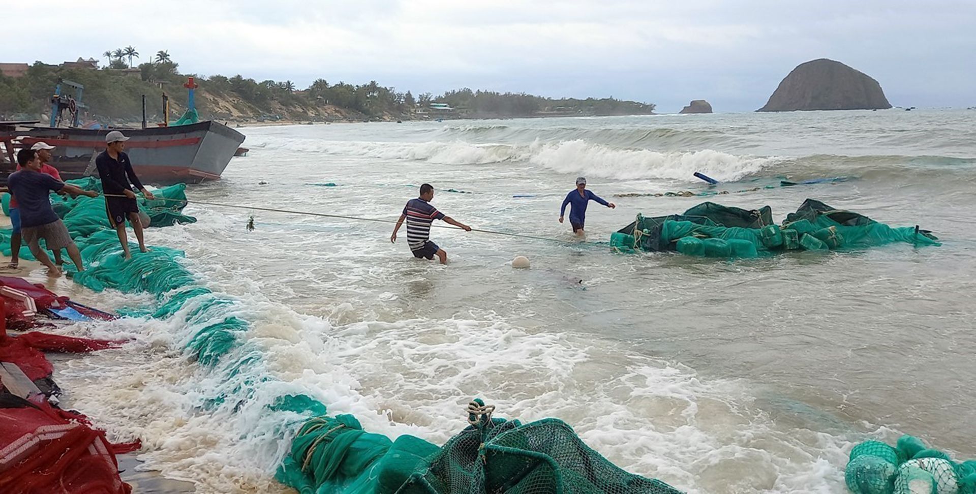 Ngư dân xã An Hòa Hải, huyện Tuy An, tỉnh Phú Yên trục vớt tàu bị sóng đánh chìm lên bờ để sửa chữa. (Ảnh: Xuân Triệu)