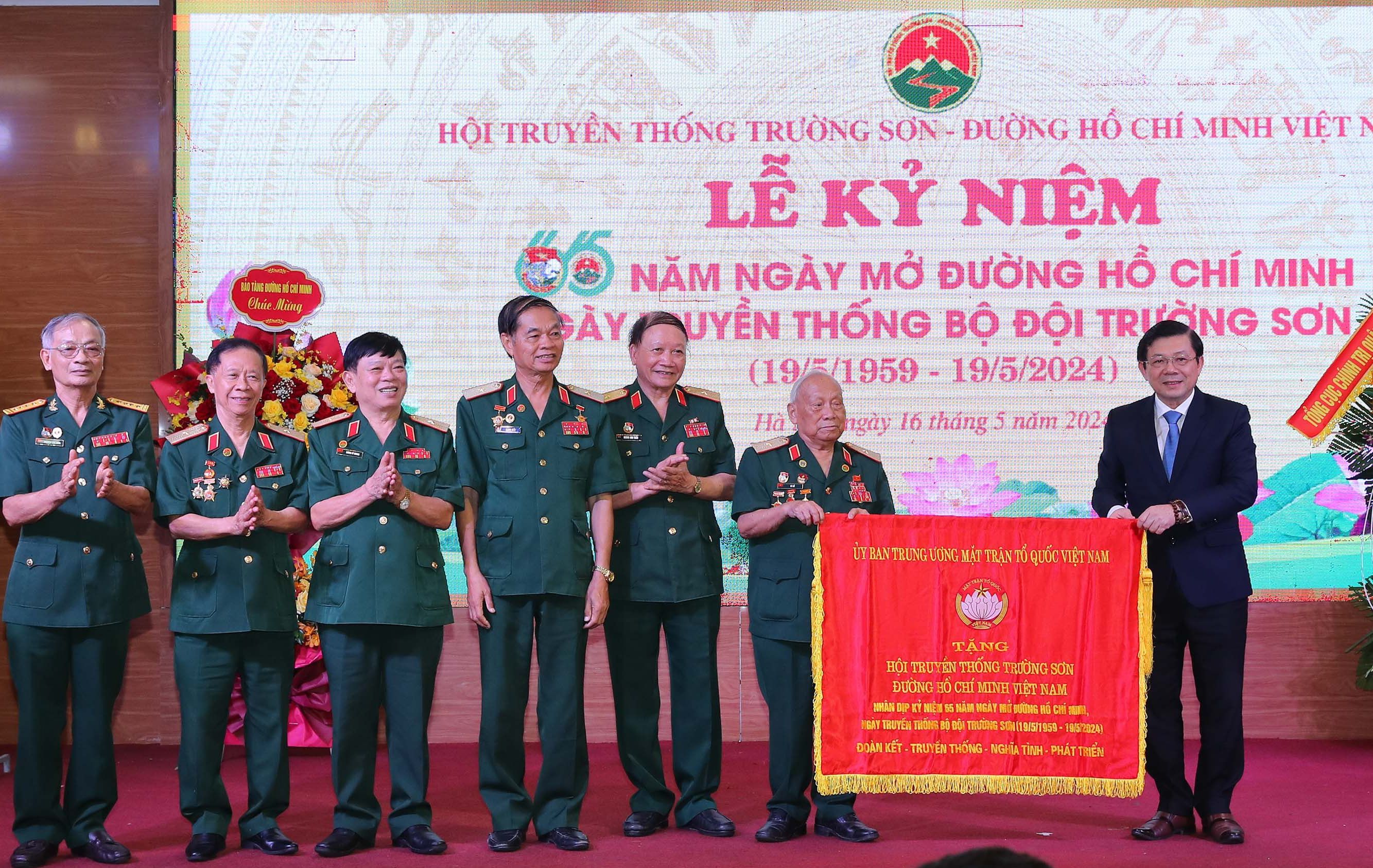 Đại diện Ủy ban Trung ương Mặt trận Tổ quốc Việt Nam ngày 16/5/2024 trao tặng Hội Trường Sơn Việt Nam bức trướng "Đoàn kết-Truyền thống-Nghĩa tình-Phát triển" tại lễ kỷ niệm 65 năm Ngày mở đường Hồ Chí Minh - Ngày truyền thống Bộ đội Trường Sơn. Ảnh: TRỌNG ĐỨC