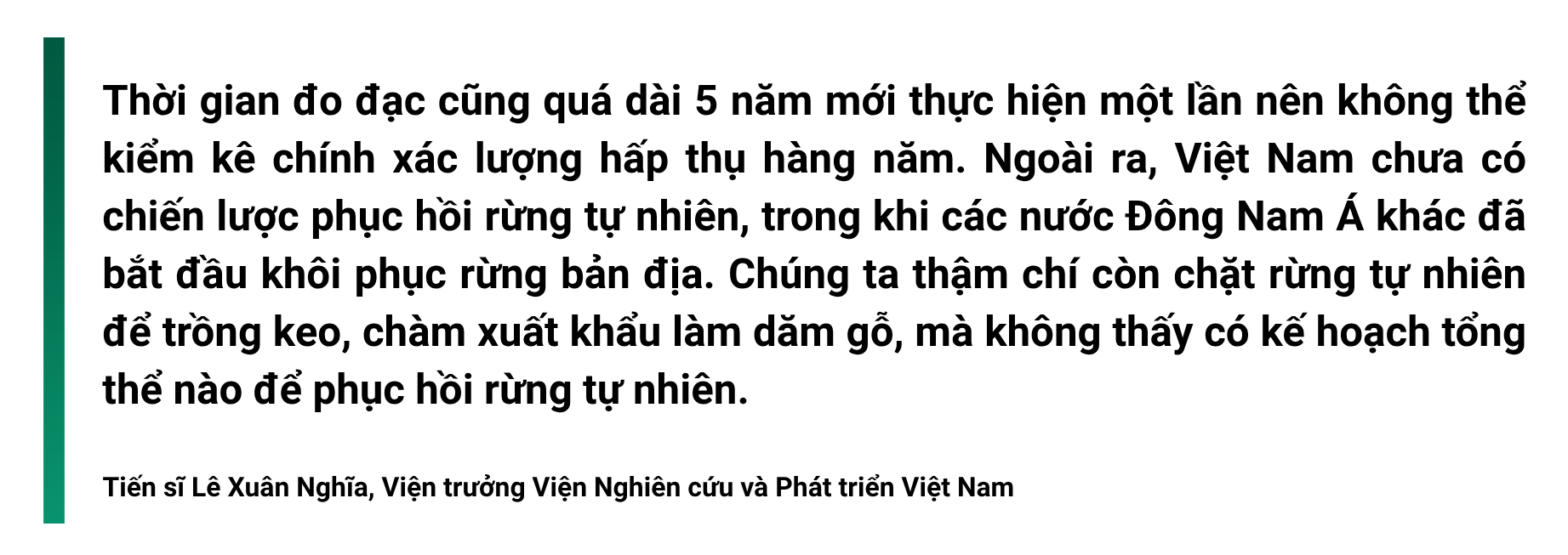 Điều đáng nói là chưa từng có một cuộc đo đạc quy mô toàn quốc nào đủ chuẩn quốc tế. Vì vậy, dù rừng Việt Nam hàng ngày hấp thụ CO₂ cho cả thế giới, chúng ta vẫn “làm không công”, không thu được gì.