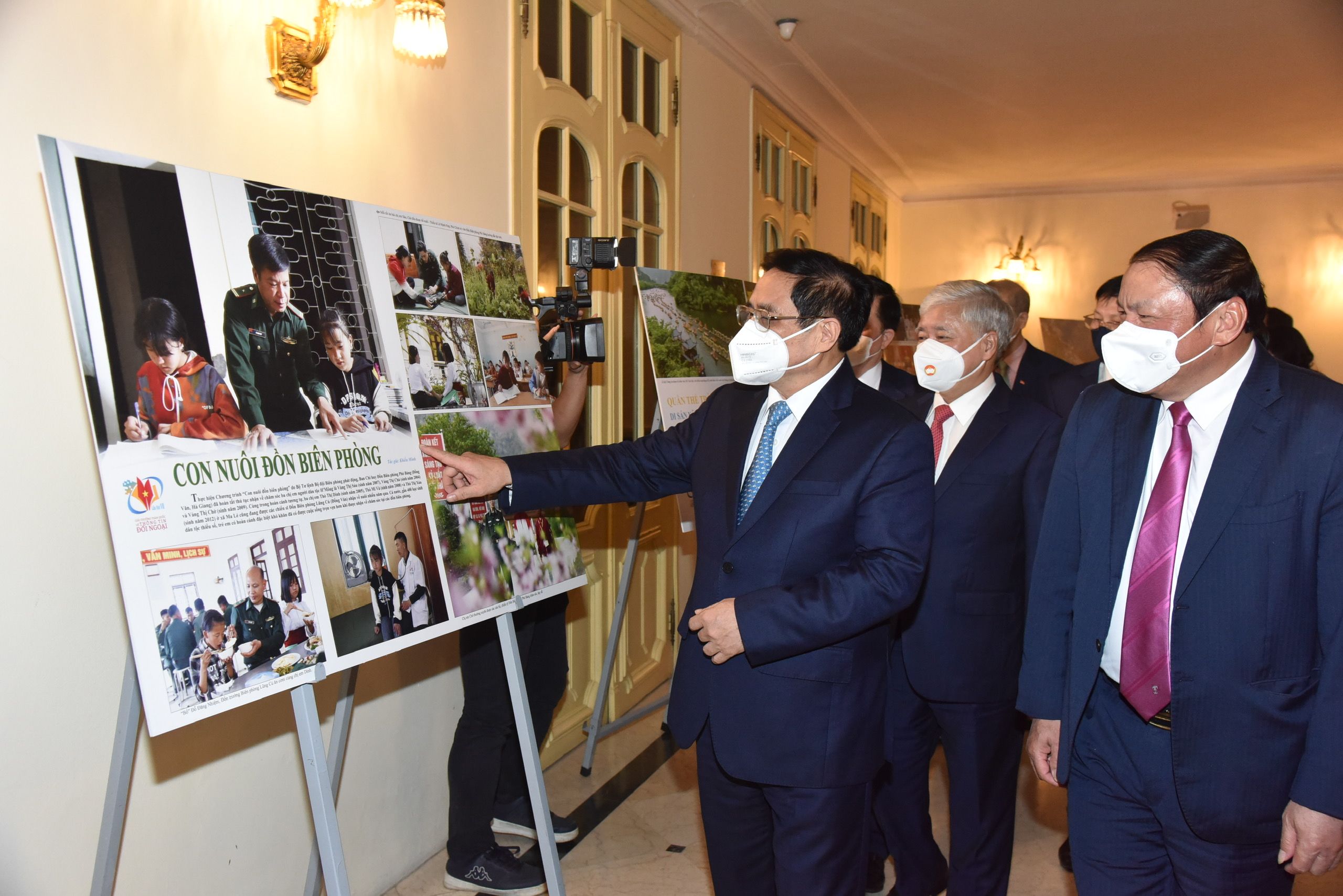 Thủ tướng Phạm Minh Chính và các đại biểu tham quan trưng bày ảnh các tác phẩm đoạt giải.