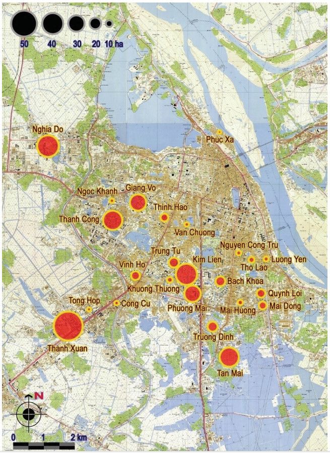 Bản đồ phân bố các khu tập thể được xây dựng trong giai đoạn 1954-1986 trong đô thị trung tâm Thành phố Hà Nội.