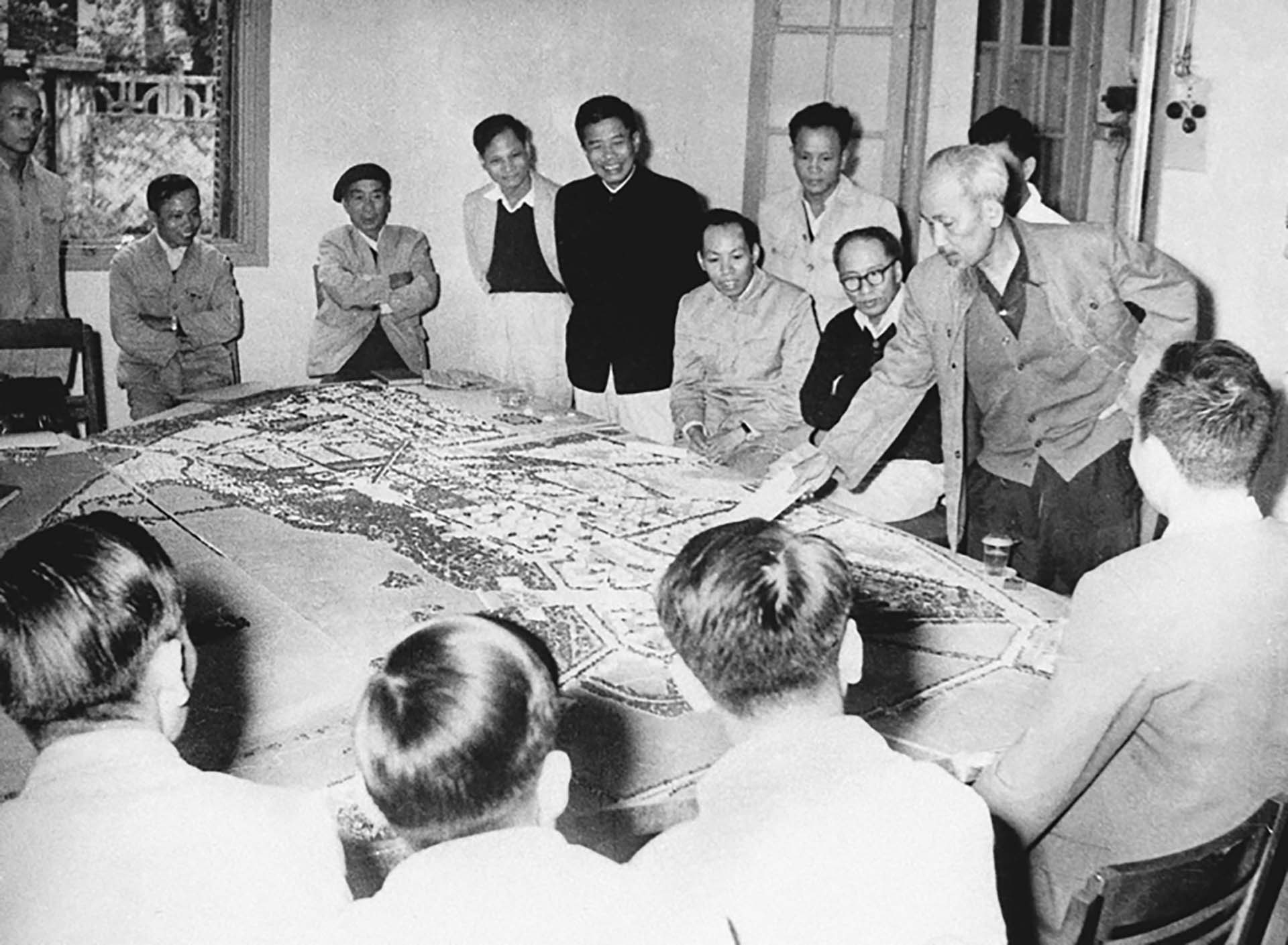 Chủ tịch Hồ Chí Minh xem mô hình quy hoạch xây dựng Thủ đô Hà Nội ngày 16/11/1959. Ảnh: hochiminh.vn