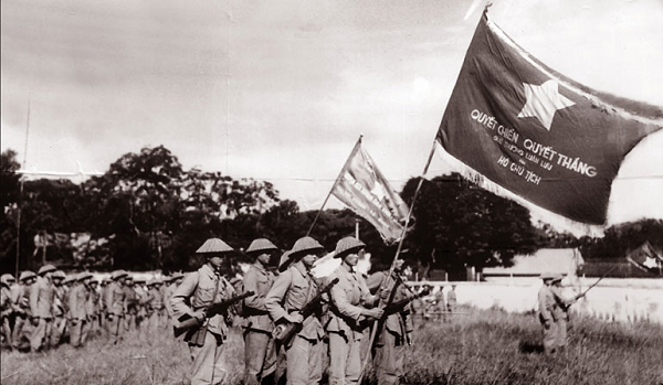 Lá cờ Quyết chiến quyết thắng tung bay tại Lễ chào cờ trên sân Cột Cờ, Hà Nội, tháng 10/1954. Ảnh tư liệu
