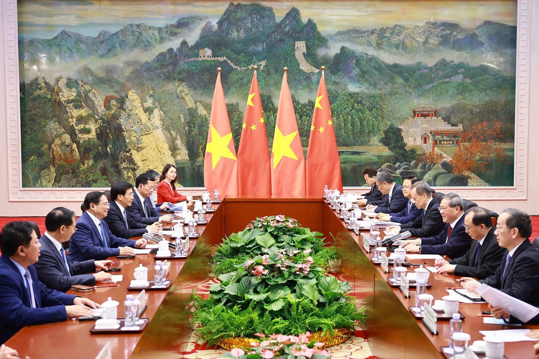 Trong khuôn khổ dự Hội nghị thường niên các nhà tiên phong lần thứ 16 của Diễn đàn Kinh tế thế giới (WEF 16 Thiên Tân) tổ chức tại Thiên Tân và làm việc tại Trung Quốc, ngày 24/6/2025, Thủ tướng Chính phủ Phạm Minh Chính hội đàm với Thủ tướng Quốc Vụ viện Trung Quốc Lý Cường. (Ảnh: TTXVN)