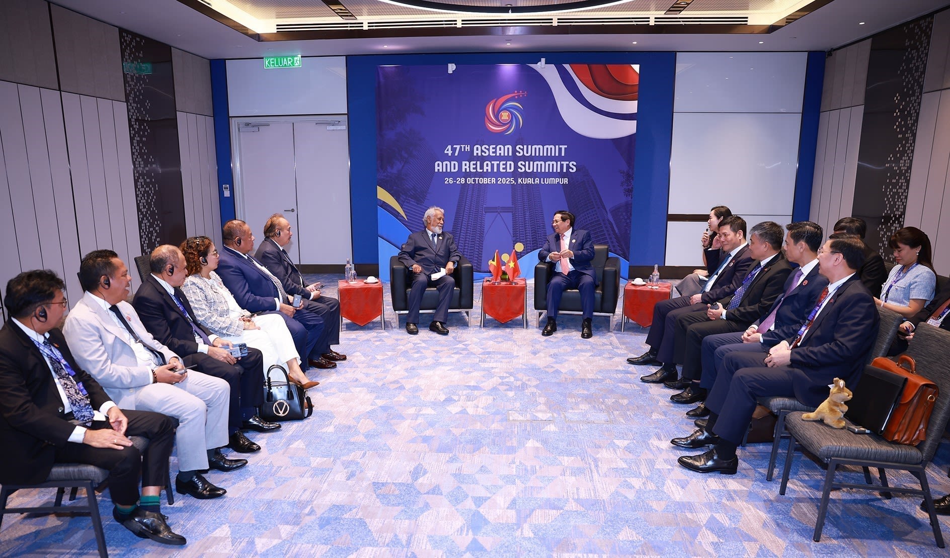 Thủ tướng Phạm Minh Chính gặp Thủ tướng Malaysia Anwar Ibrahim, Chủ tịch ASEAN 2025. (Ảnh: TTXVN)