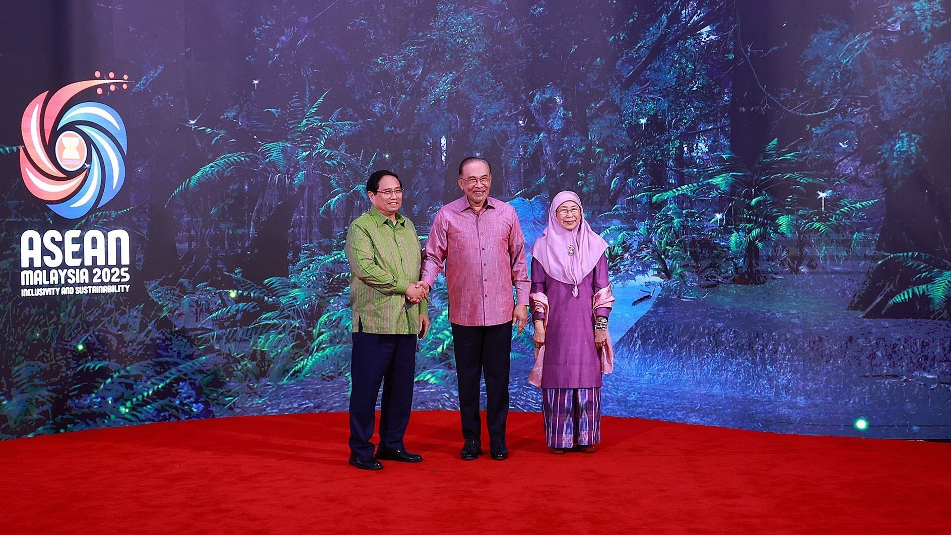 Thủ tướng Malaysia Anwar Ibrahim, Chủ tịch ASEAN 2025 và Phu nhân đón Thủ tướng Phạm Minh Chính. (Ảnh: TTXVN)