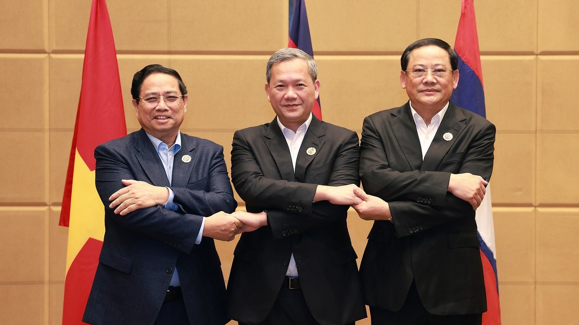 Thủ tướng Phạm Minh Chính cùng Thủ tướng Campuchia Hun Manet và Thủ tướng Lào Sonexay Siphandone. (Ảnh: TTXVN)