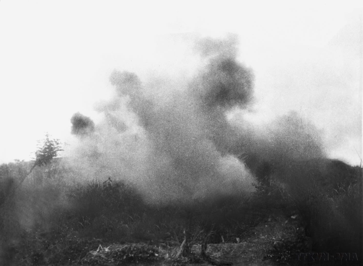 Các vị trí của địch trên đồi Him Lam bị trúng đạn pháo của ta đang bốc cháy, các vị trí trên đồi này đã bị tiêu diệt ngay trong ngày 13/3, ngày mở đầu chiến dịch. Ảnh: TTXVN