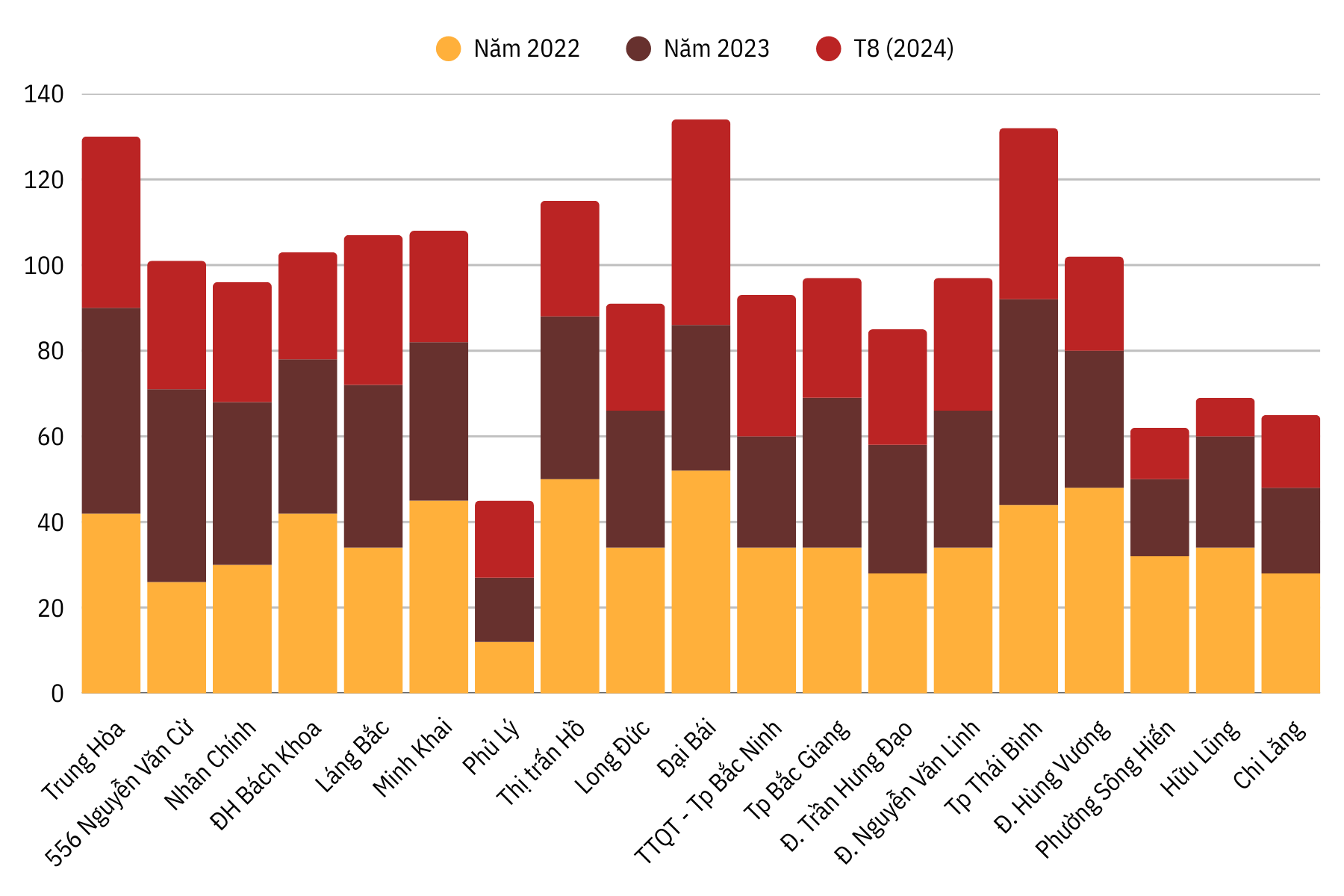 Diễn biến giá trị bụi mịn PM2.5 trung bình năm tại một số trạm quan trắc quanh Hà Nội từ 2022 đến 2024. Nguồn: Cục Môi trường.