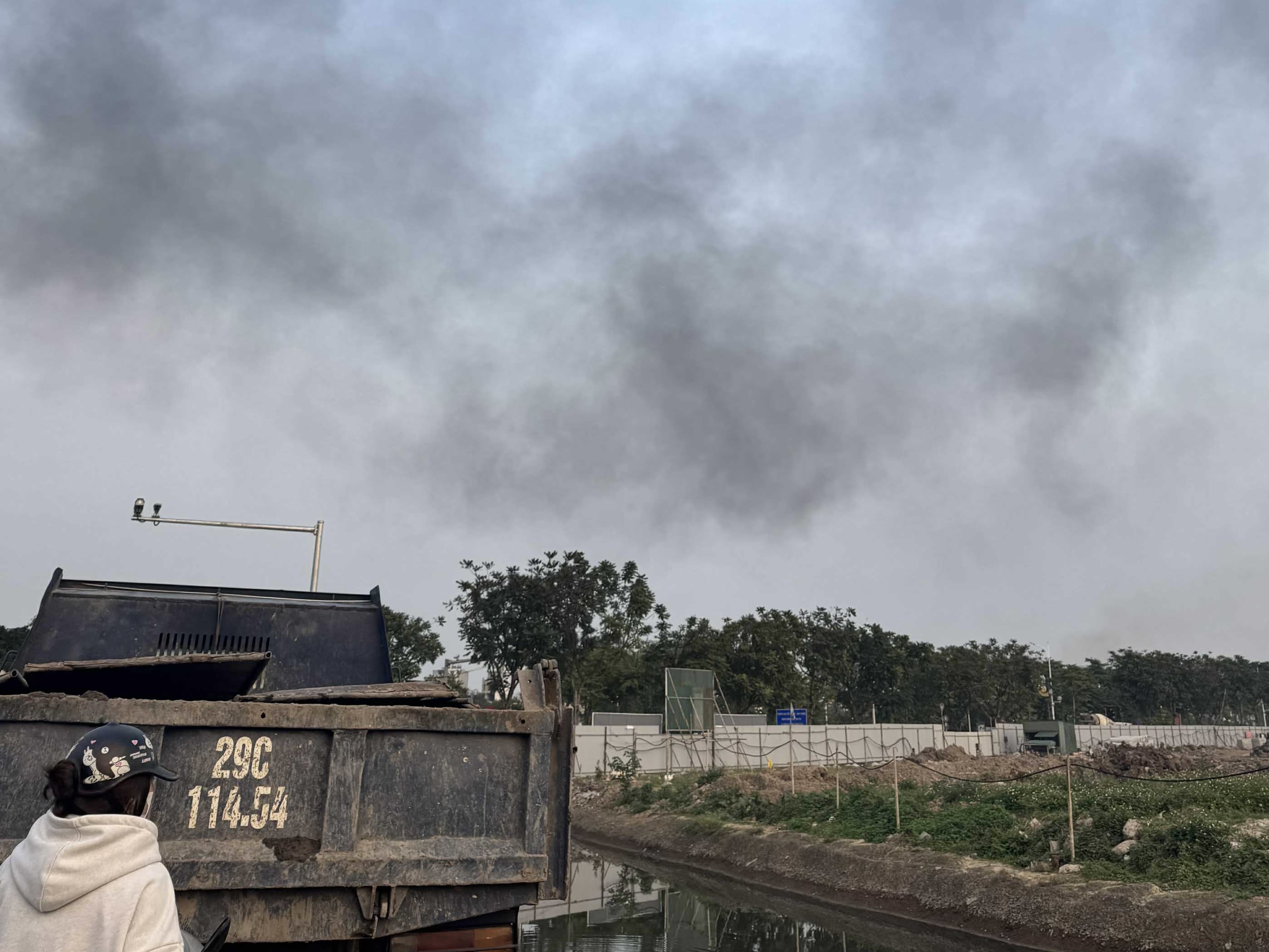 Chiều ngày 8/12, tại Đê Xuân Quan (Gia Lâm, Hà Nội), đoạn rẽ vào khu đô thị Ocean Park 1, khói đen sẫm, kết thành từng mảng lớn lơ lửng trên bầu trời, kèm theo mùi cháy khét. Chúng tôi giơ máy bấm. Những khung hình màu tím của khói lẫn trong màu trời xám xịt của mùa đông, nhìn thôi cũng đã thấy ngộp thở.
