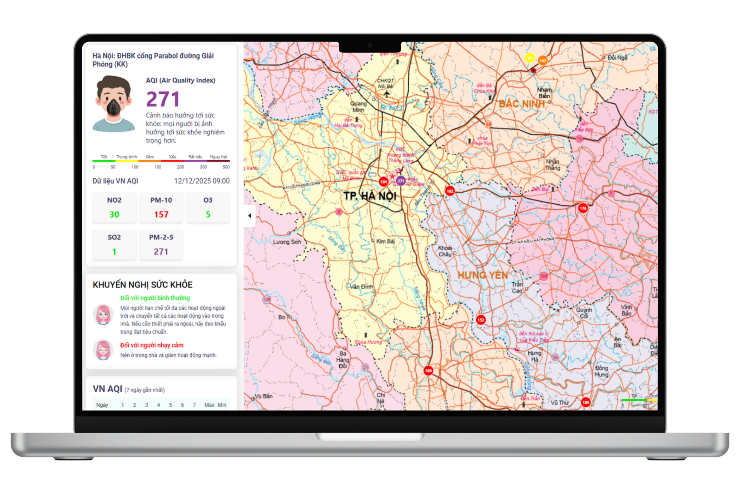 Hình ảnh các trạm quan trắc ở Hà Nội và khu vực phụ cận sáng 12/12/2025 đều cho chỉ số ở ngưỡng xấu và nguy hại cho sức khỏe.
