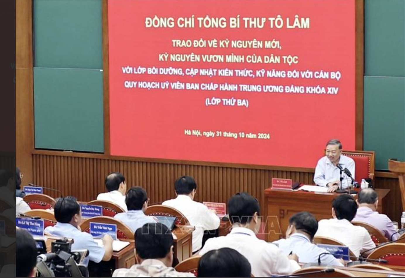Ngày 31/10/2024, tại Học viện Chính trị quốc gia Hồ Chí Minh, GS, TS Tô Lâm, Tổng Bí thư Ban Chấp hành Trung ương Đảng Cộng sản Việt Nam có buổi trao đổi một số nội dung về kỷ nguyên mới, kỷ nguyên vươn mình của dân tộc với các học viên Lớp bồi dưỡng, cập nhật kiến thức, kỹ năng đối với cán bộ quy hoạch Ủy viên Ban Chấp hành Trung ương Đảng khóa XIV (lớp thứ 3). Hội nghị Ban Chấp hành Trung ương lần thứ 10 khóa XIII thống nhất khẳng định Việt Nam bước vào kỷ nguyên vươn mình của dân tộc. Tôi đã đọc và nghiên cứu kỹ lưỡng, nghiêm túc, bày tỏ sự đồng tình, tin tưởng ở tầm nhìn, định hướng chiến lược, những nội dung quan trong, mới mẻ mà Đảng ta và Tổng Bí thư Tô Lâm nêu ra khi đề cập đến khái niệm “kỷ nguyên mới”, “kỷ nguyên vươn mình của dân tộc”, “cơ sở định vị mục tiêu, nhiệm vụ”, “7 định hướng chiến lược” đưa đất nước bước vào kỷ nguyên mới, kỷ nguyên vươn mình của dân tộc.