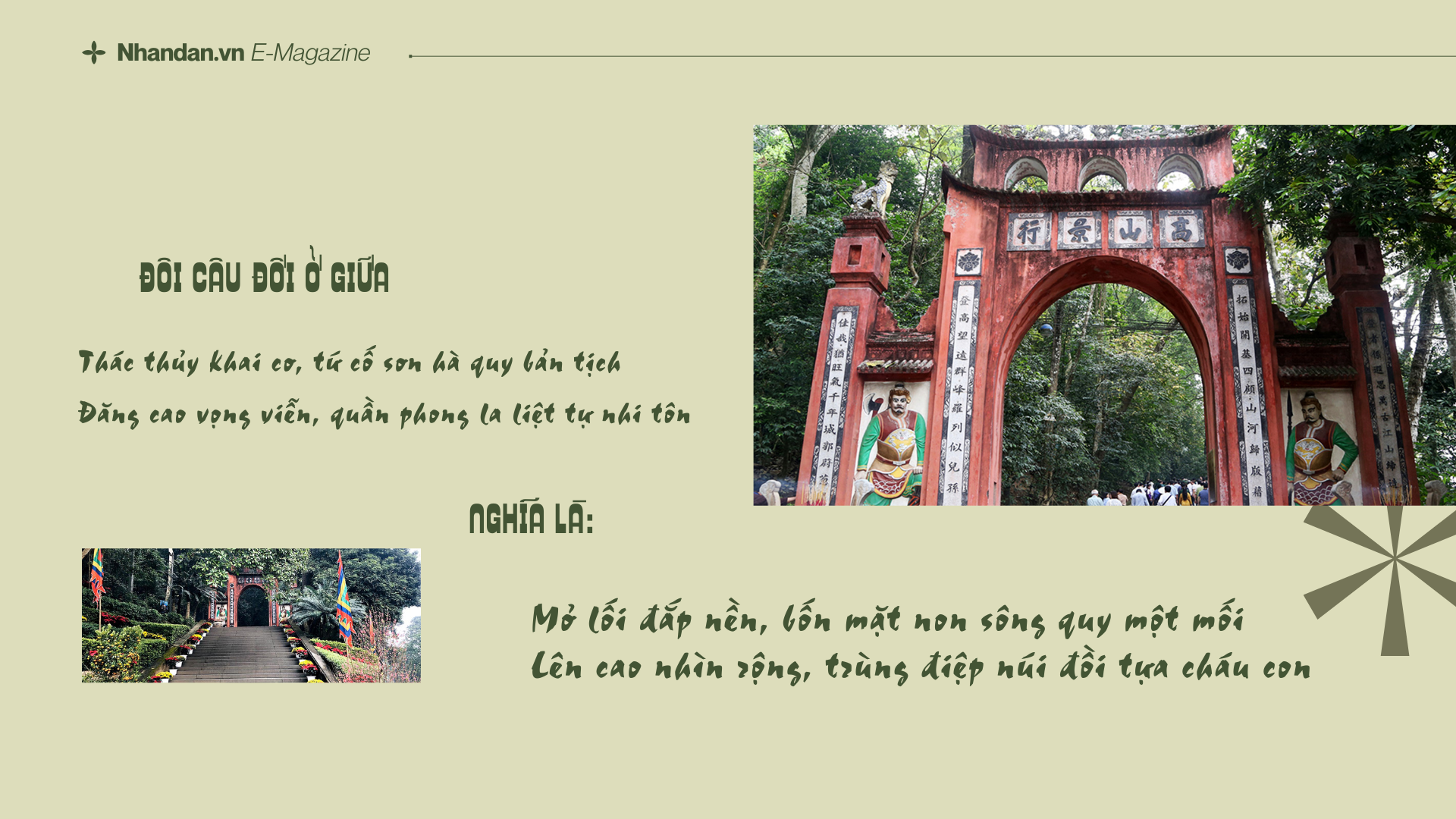 Để diễn tả ý đó, câu đối ở hai trụ trung tâm cổng chính, dựng theo lối tam quan - bốn cột của đền Hùng ghi: