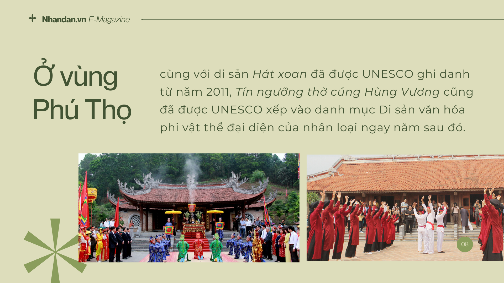 Ở vùng Phú Thọ, cùng với di sản Hát xoan đã được UNESCO ghi danh từ năm 2011, Tín ngưỡng thờ cúng Hùng Vương cũng đã được UNESCO xếp vào danh mục Di sản văn hóa phi vật thể đại diện của nhân loại ngay năm sau đó. Cũng qua việc thực hiện tín ngưỡng thờ Vua Hùng mà văn hóa dân gian quanh vùng Nghĩa Lĩnh lưu truyền đời này qua đời khác. Lễ giỗ Tổ còn là hội của các trò vui dân gian, của những cây đu, của các phường xoan... Đến nay, lễ này đã là “quốc lễ” nhưng “yếu tố gốc” dân gian của tín ngưỡng này vẫn được bảo tồn, để hội đền Hùng, ngày giỗ Tổ vẫn mang tính dân gian, là ngày hội của thập phương khách hành hương ngày càng đông.